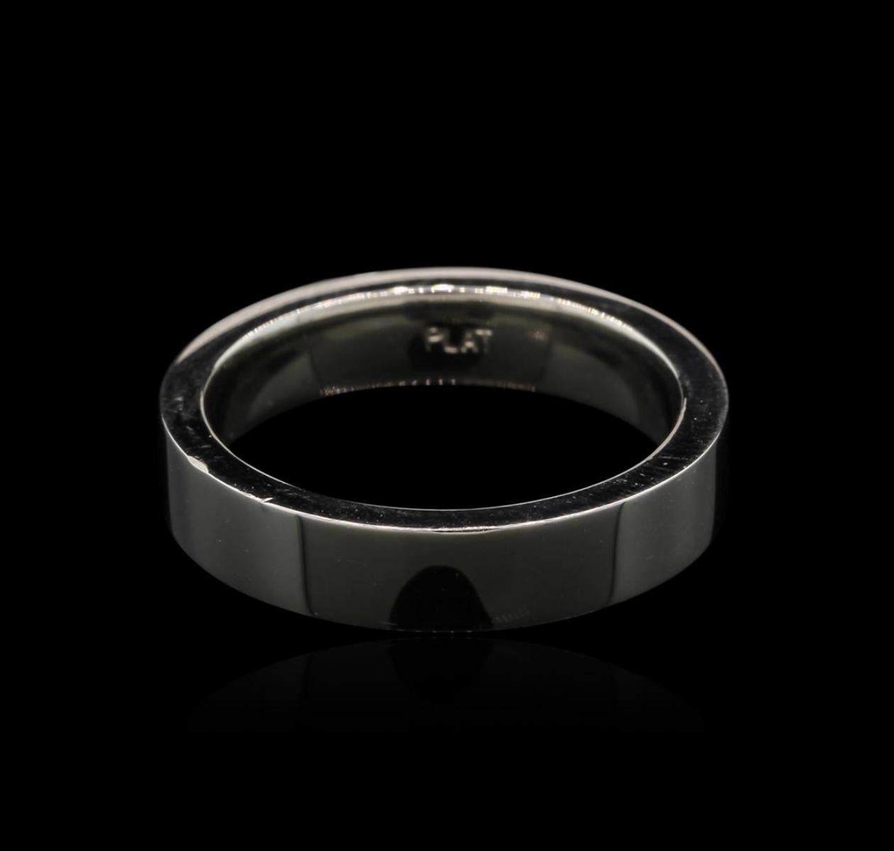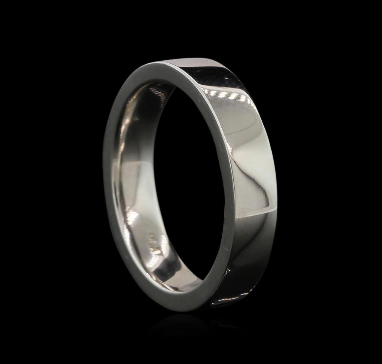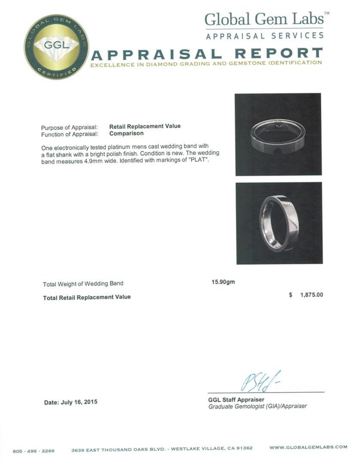 One electronically tested platinum mens cast wedding band with a flat shank with a bright polish finish. The wedding band measures 4.9mm wide. Identified with markings of "PLAT". Condition is new. Total Weight of Wedding Band 15.90 grams. GGL Appraised at $1,875.00.