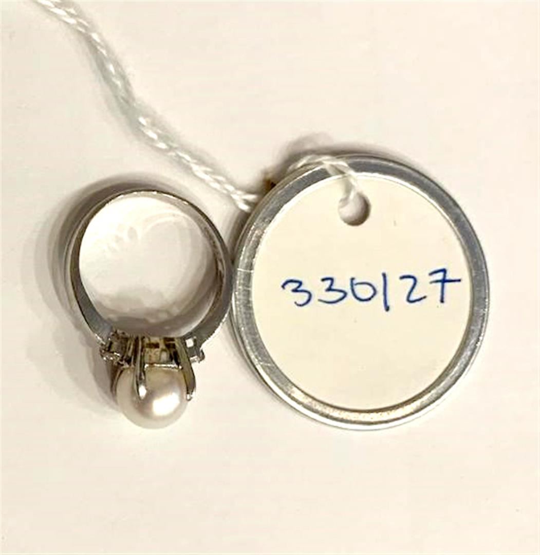 Platinum mounted pearl & diamond ring, the pear measuring 8mm in diameter with approximately .06 carats of diamonds, interior marked P900 900 to interior; gross weight 4.3 g, size 6