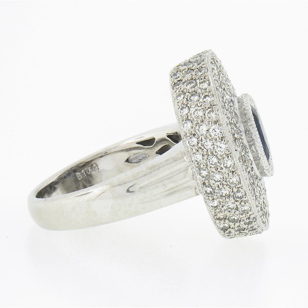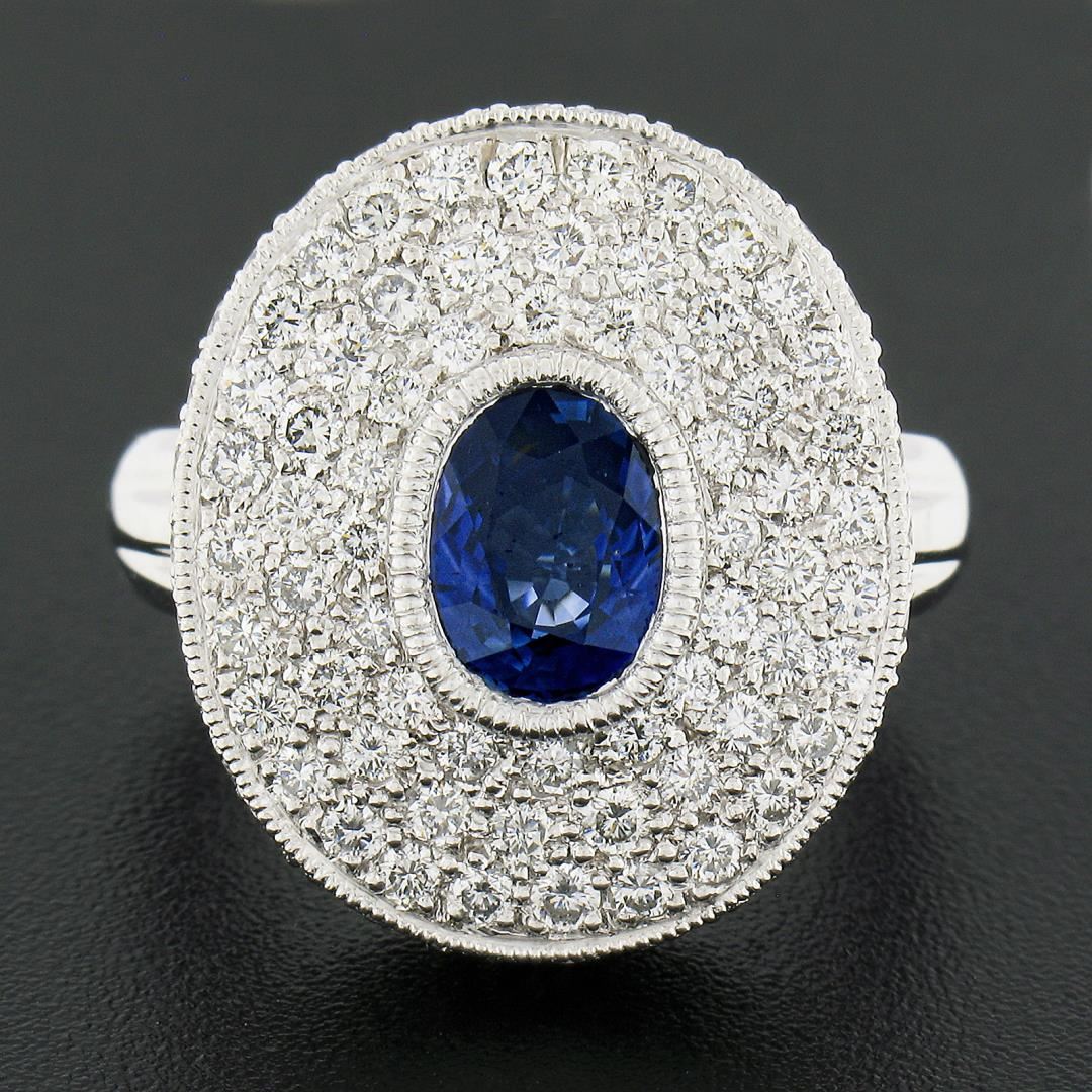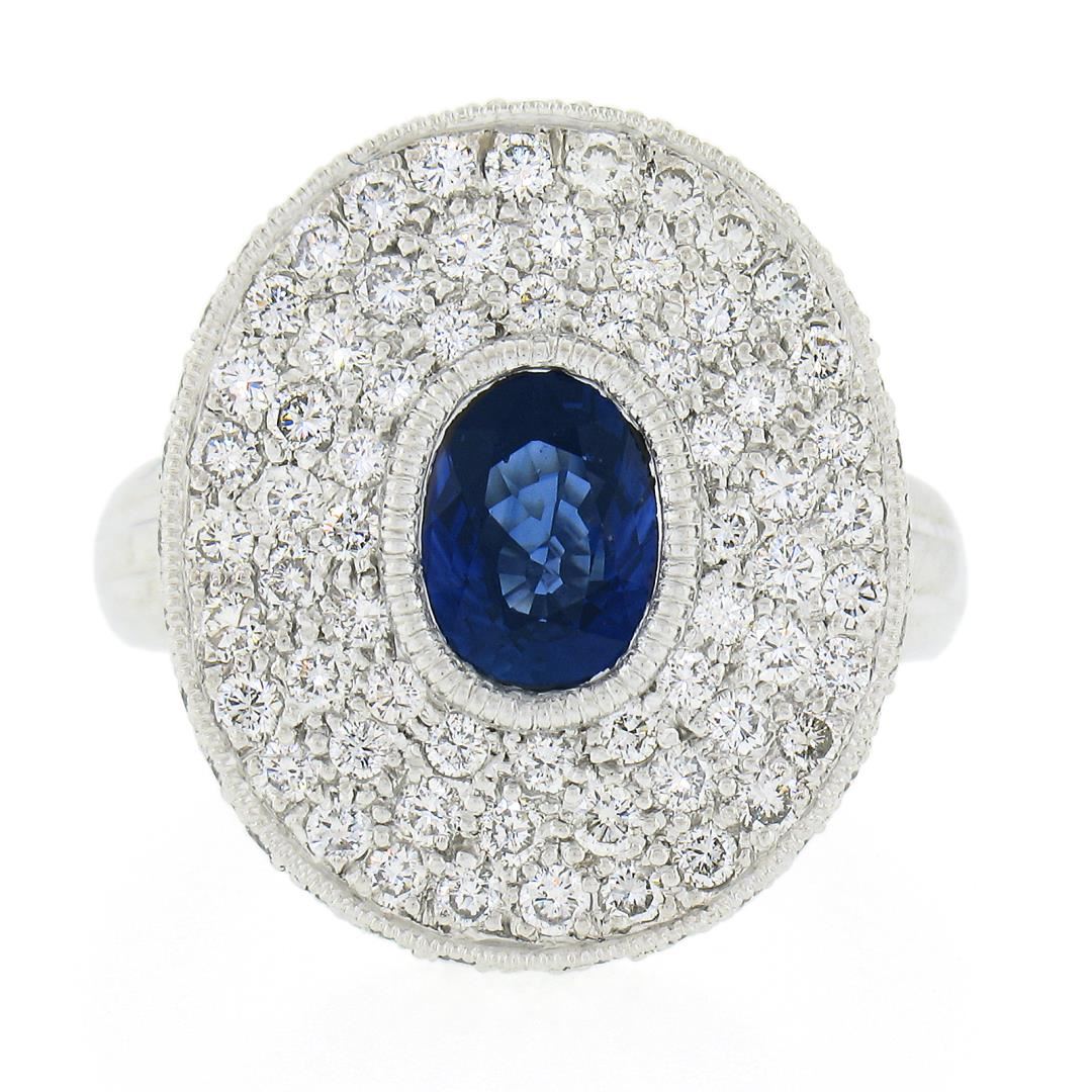A solid paltinum platter ring, featuring 1 oval cut natural sapphire (1.74ct), and 159 round brilliant cut natrual diamonds ( F/G - VS1/VS2 ; 2.78ctw). The ring is size 7.0, weighs a total of 15.97 grams, and measures 21.1mm wide.