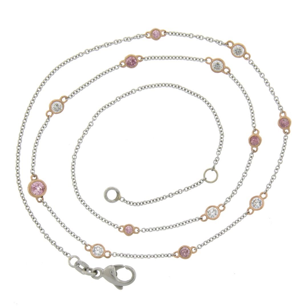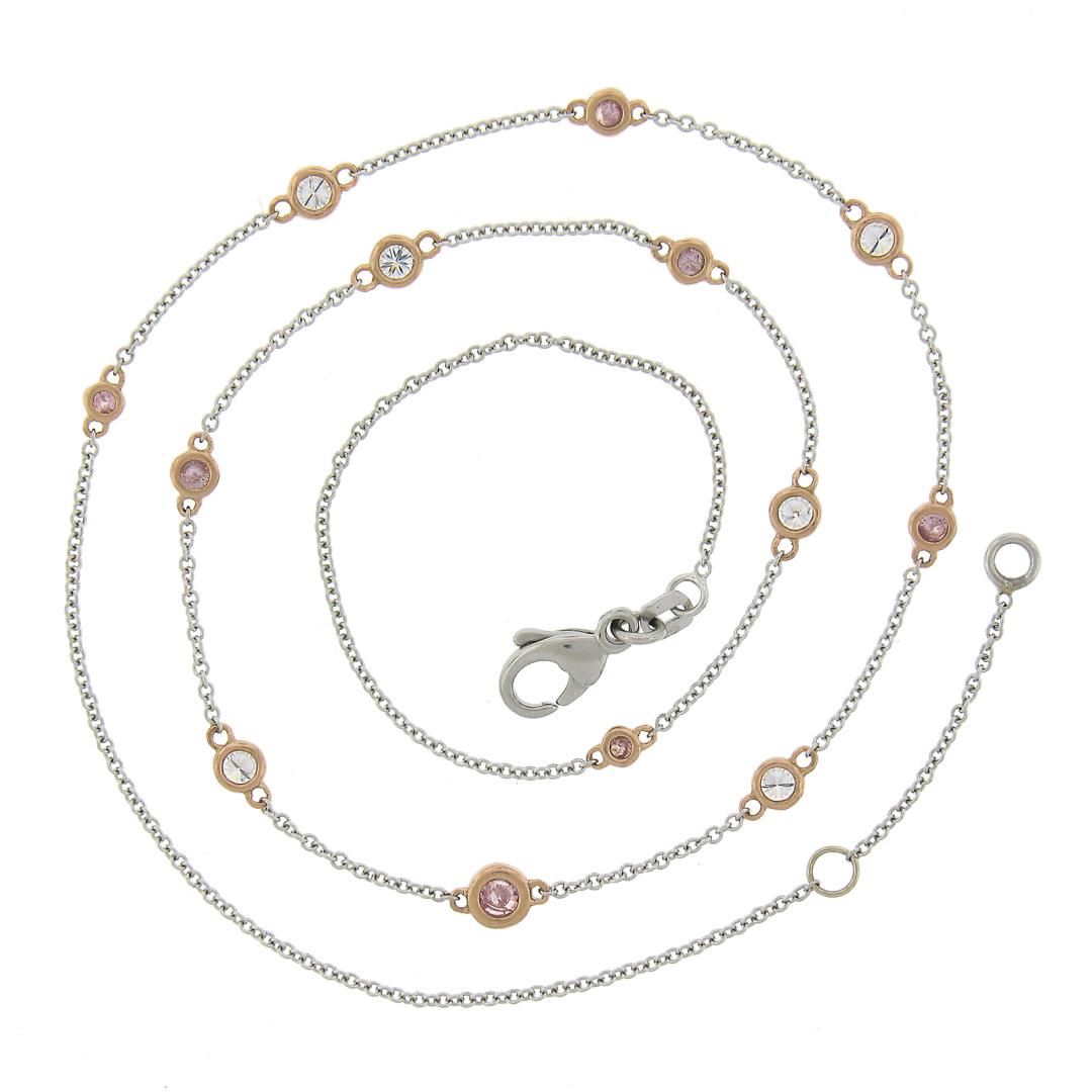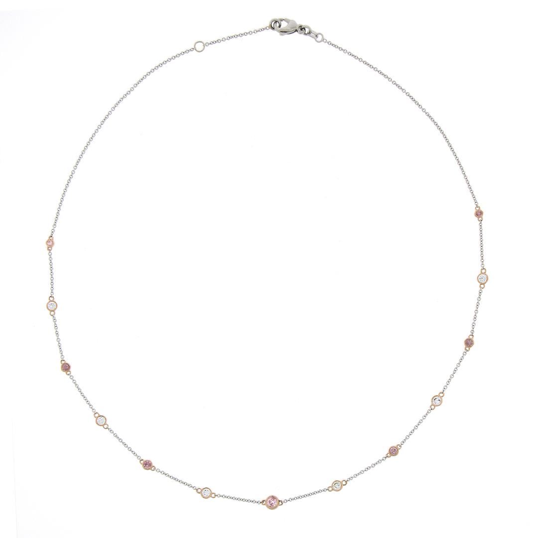 A solid platinum & rose gold by the yard necklace, with 7 GIA graded round cut pink diamonds (SI1-I2 Clarity - 0.45-0.50ctw), and 6 round cut white diamonds (G/H - VS2-SI2 ; 0.60ctw). It weighs a total of 4.72 grams, measures 3.8mm wide, and measures adjustable 17.5 or 18.5 inches in length. Comes with all original relevant certifications.