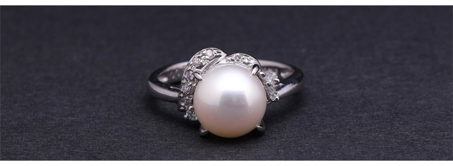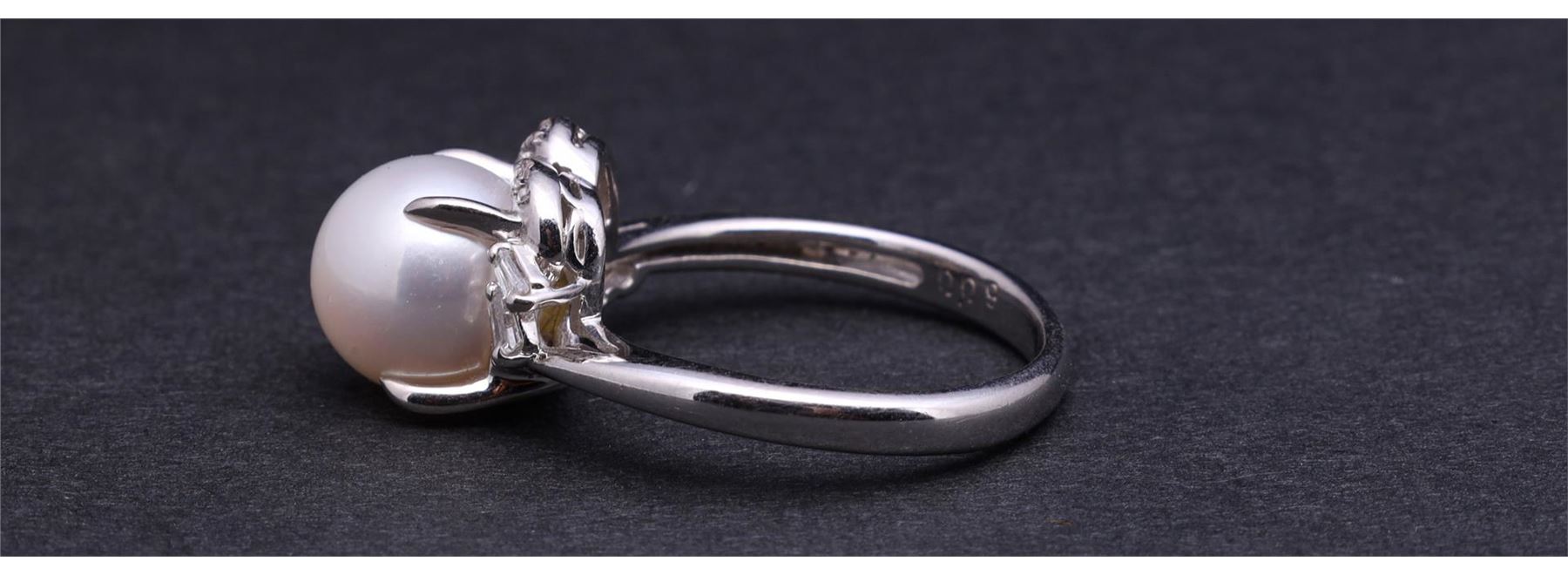 A platinum ring set with South Sea round pearl measuring approximately 9mm with approximately .09 carats of diamond accents to shoulder, the interior of the ring marked Pt900 0.09; gross weight 5.3 g, size 5 1/2