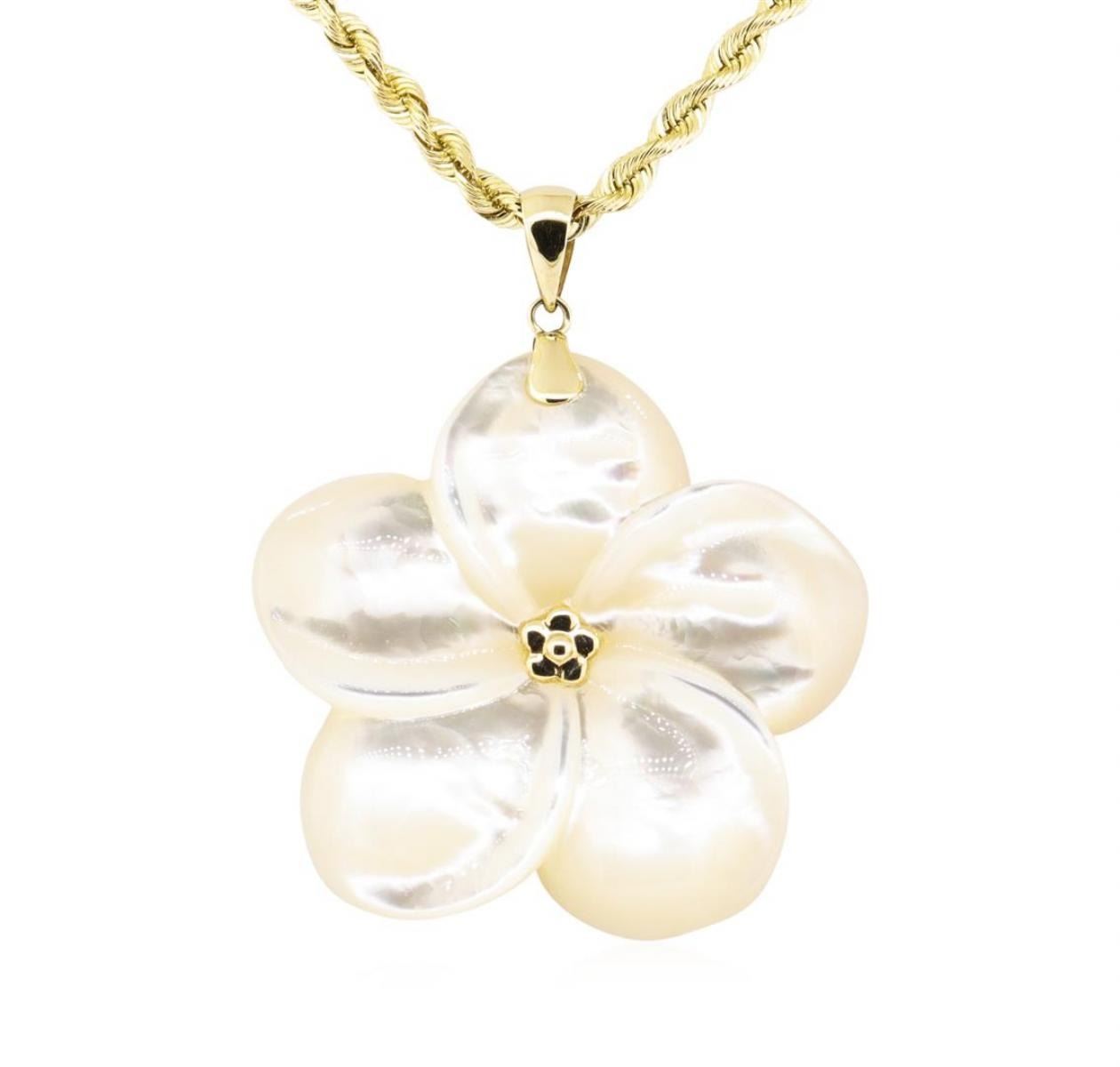 One plumeria shaped pendant with an attached 18 inch long 3mm diamond cut rope link chain featuring: 14KT yellow gold weighing 16.8 grams containing one piece of hand-carved mother of pearl.
