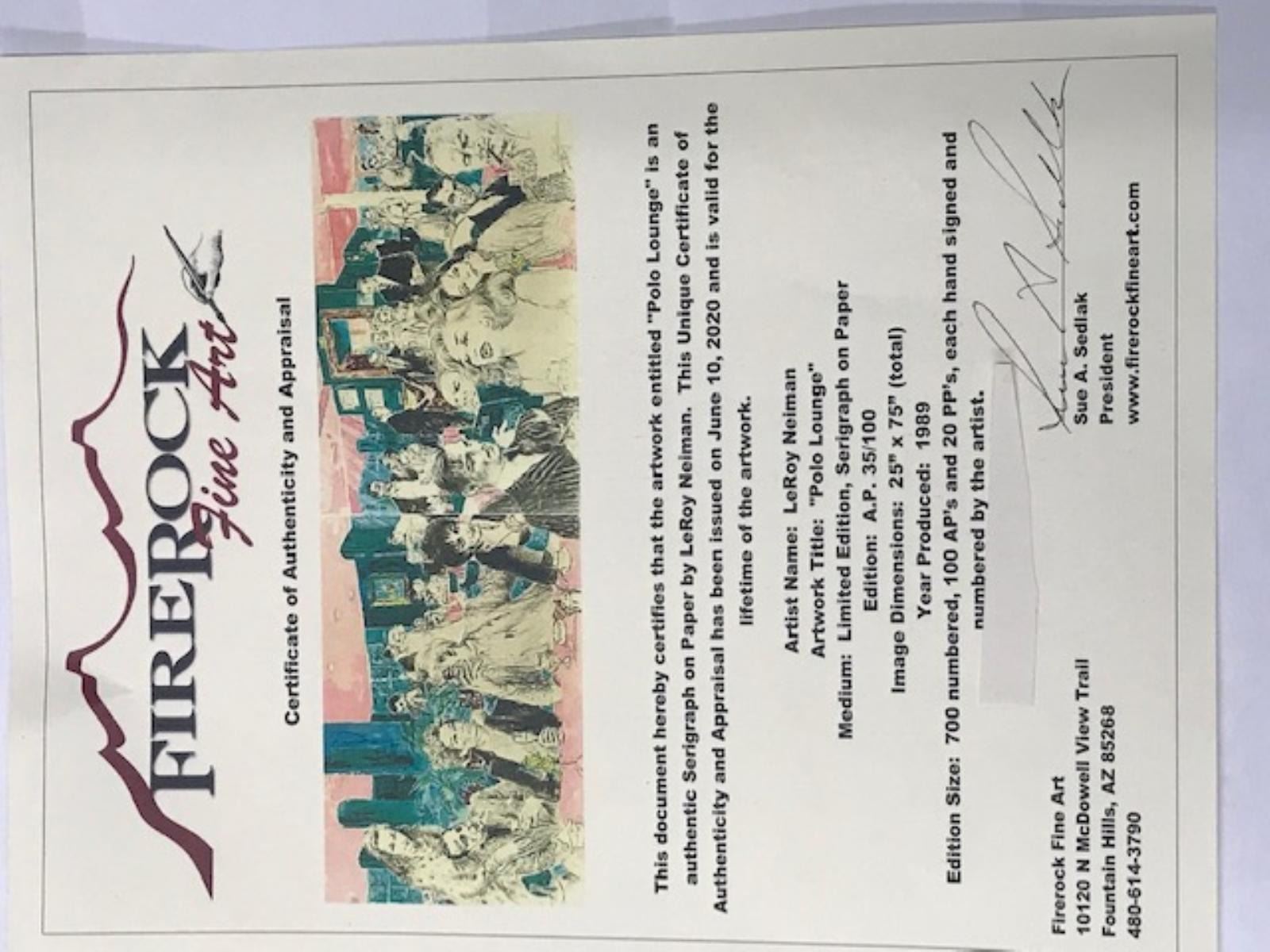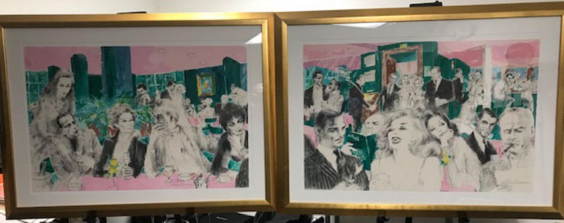 "Polo Lounge" by LeRoy Neiman Set - Limited edition serigraph #1 of 250 = 2 Matching pieces 48" x 35" each. "Polo Lounge" by LeRoy Neiman - COA Included - This is a rare Diptych Serigraph by LeRoy Neiman titled "Polo Lounge" from his tribute to his infamous bar and social scenes across the world. ~ "I bring personal and sentimental baggage to this work," Neiman explained. "As a guest, I have felt at home in the bungalows of The Beverly Hills Hotel for many years. As a stargazer, I have always enjoyed the unique showcase that is the Polo Lounge. Stars here have left a special imprint on my memory, so there was something magical for me in creating this sampling of Hollywood's elite." And what a sampling it is! LeRoy Neiman has drawn together a remarkable group of personalities who have dominated the Hollywood scene from both in front and behind the cameras. Near Marilyn Monroe and Clark Gable sits a sly W.C. Fields, and, yes, he is holding his menu upside down. Famed gossip columnist Hedda Hopper is perched within earshot of Bogie and Bacall, who seem to be keeping an eye on Katherine Hepburn and John Huston. Elizabeth Taylor, regal and bejeweled, enjoys a quiet cup of coffee. Frank and Barbara Sinatra are making their entrance, perhaps to join Frank's fellow "Rat Pack" buddies Dean Martin and Sammy Davis, Jr., who have already arrived. Star-makers Darryl F. Zanuck and Howard Hughes are here, as are Johnny Carson and Joan Collins from the world of television. Film greats Gary Cooper, Bette Davis, Errol Flynn, Marlene Dietrich and Greta Garbo all help lend a magical air to this glittering assemblage. It is no wonder that LeRoy Neiman feels such a special warmth toward this magnificent work.