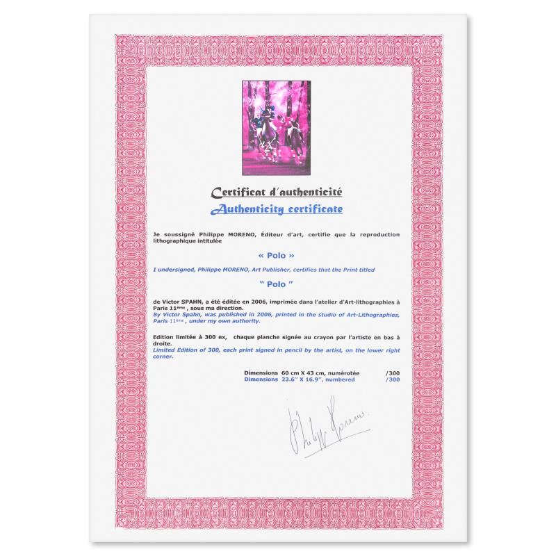 "Polo" is a limited edition lithograph on paper by Victor Spahn. Printed at Art-Lithographies workshop in Paris, the piece is hand signed by the artist and comes with a certificate of authenticity. This piece is custom framed. Measures approximately 31.5" x 25" (frame), 23.5" x 17" (image).