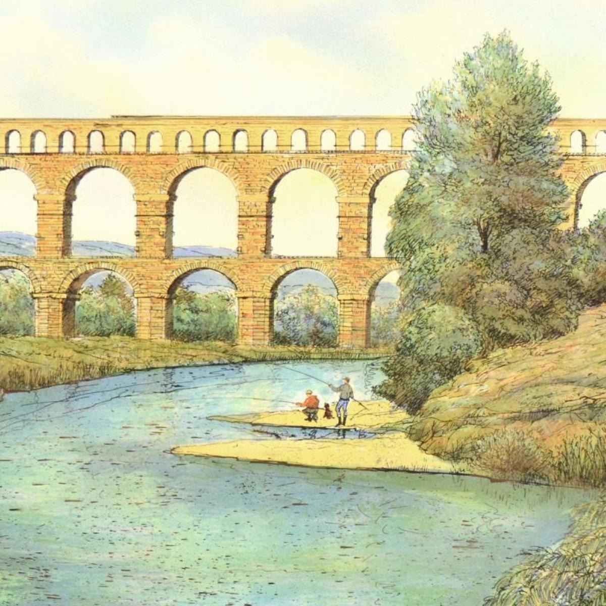 "Pont du Gard Aqueduct" is a limited edition lithograph on paper by Rolf Rafflewski, numbered and hand signed by the artist! Measures approx. 29.5" x 21" (border). 27" x 19" (image).
