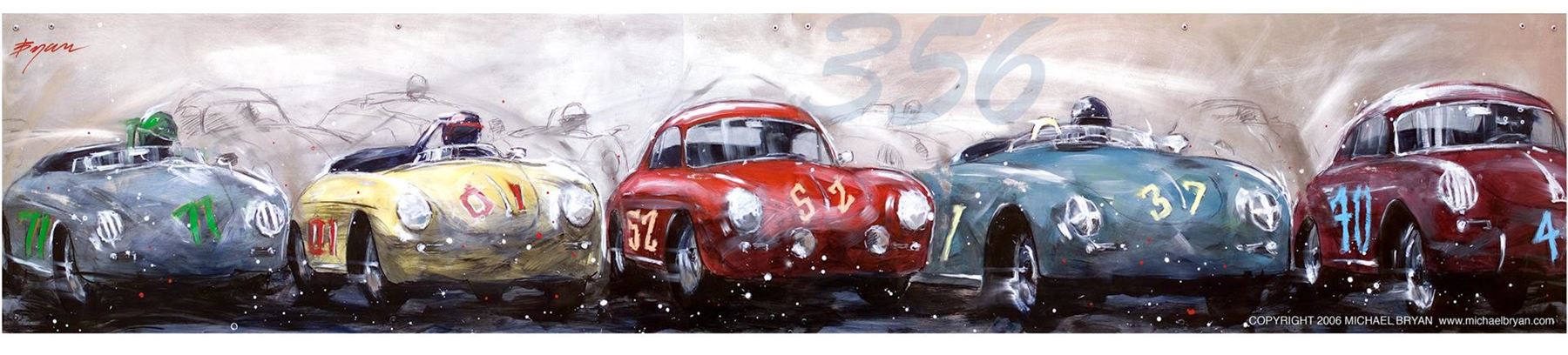 Michael Bryan pays tribute one of his favorites, the Porsche 356 in this wide-angle view of the Classic cars. A hand-worked giclee on canvas, this is 40x8.5", numbered 1/1 Unique.