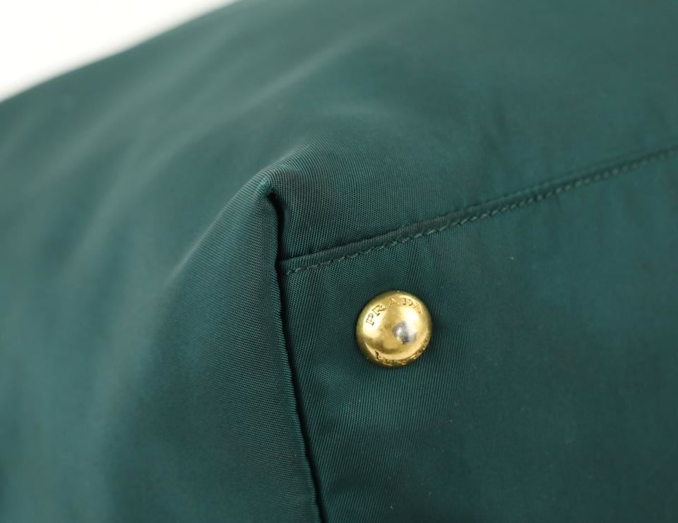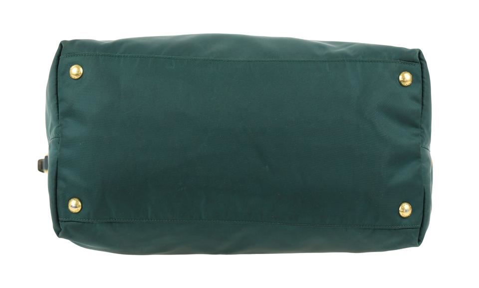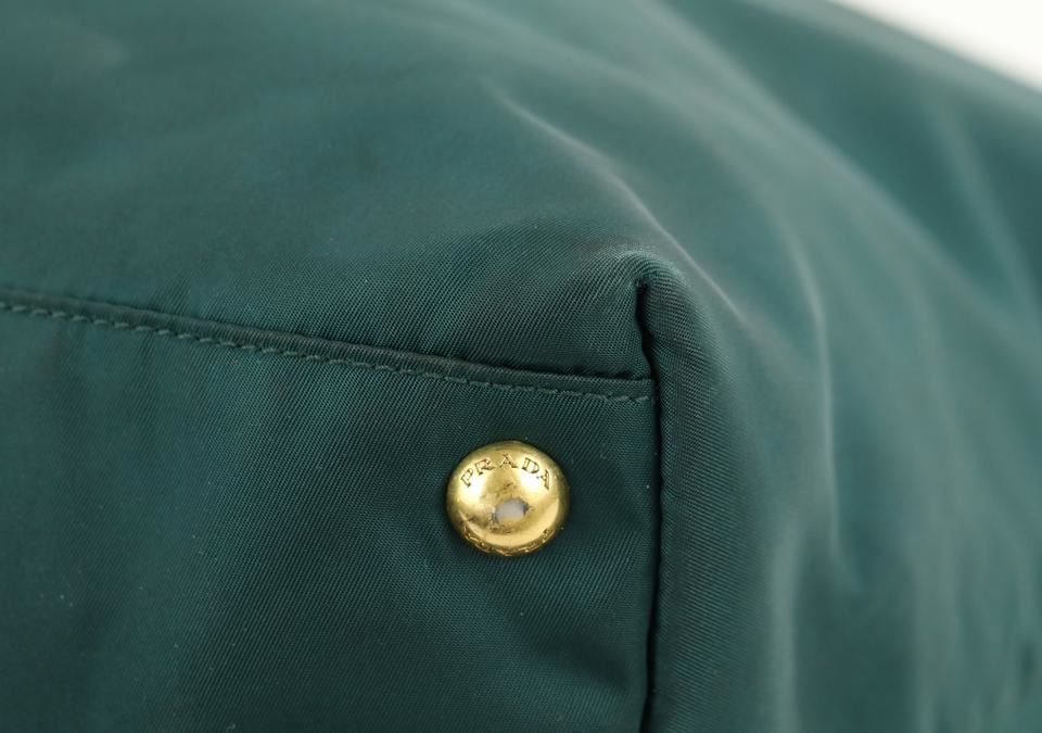 One Prada Bag Tessuto Green Nylon Tote. Prada Deep Green Tessuto Nylon Tote Bag Handle drop . " Bag can be carried by the handles and over the shoulder Nylon exterior Black jacquard interior lining Saffiano leather trim and handles Gold-tone hardware Bag is not structured Top zipper closure One interior zippered pocket Exterior zippered pocket on the front Made In Italy