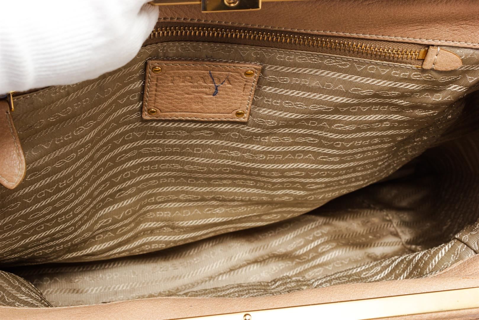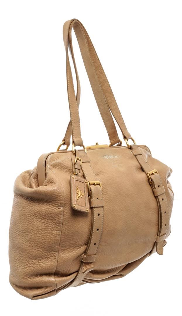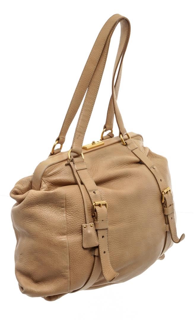 Beige Cervo leather Prada Buckle tote bag with gold-tone hardware, embossed logo accent at front MISSING, dual flat top handles featuring buckle accents, jacquard fabric lining, dual interior pockets, one with zip closure and push lock closure with key.