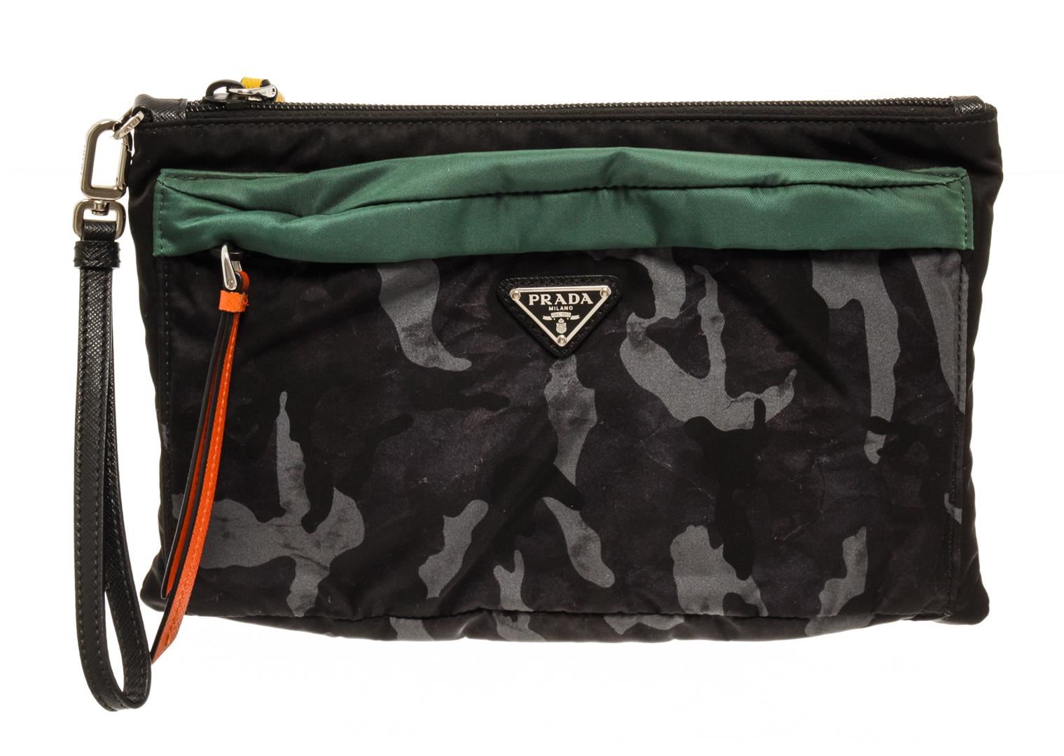 Prada Black, Gray, Green Nylon Camouflage Zip Clutch Bag. All available information is listed in the description and shown in the photos. prada black, gray, green nylon camouflage zip clutch bag 10.5"W x 6.5"H x 1"D / 26.67 x 16.51 x 2.54 CM