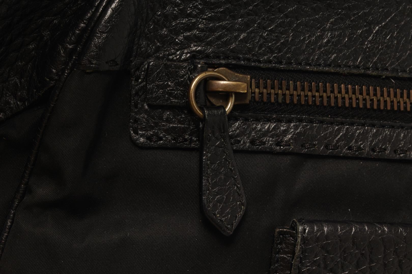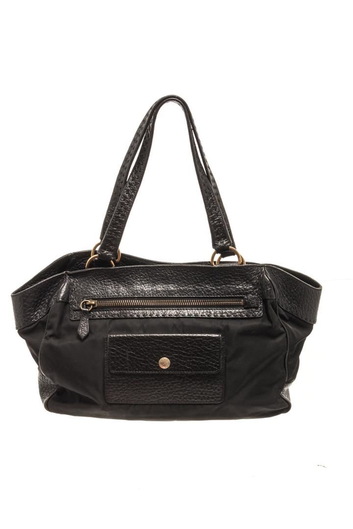 One Prada Black Leather Shoulder Bag. Item is sold AS-IS. All available information is listed in the description and shown in the photo. Prada Black Leather Shoulder Bag with shoulder strap, 2 exterior zipper pocket and snap pocket, Prada fabric lining, interior zipper pocket, snap pocket, gold tone hardware and magnetic closure. Height: 8.3" Width: 15.7" Depth: 3.7", Handle Drop: 7" / 21.08 x 39.87 x 9.39 Cm