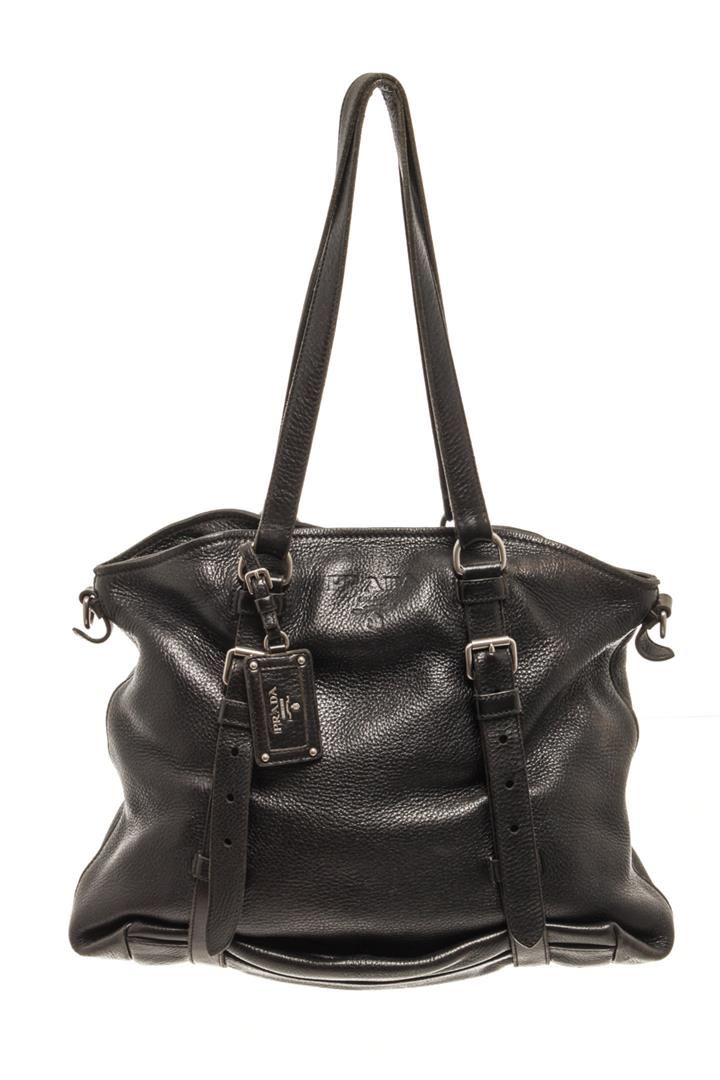 One Prada Black Leather Shoulder Bag. Item is sold AS-IS. All available information is listed in the description and shown in the photo. Prada Black Leather Shoulder Bag with shoulder strap, Prada fabric lining, interior slip pocket, silver tone hardware and magnet closure. Height: 15.74" Width: 17.32" Depth: 5.11", Handle Drop: 7.87" / 40 x 44 x 13 Cm