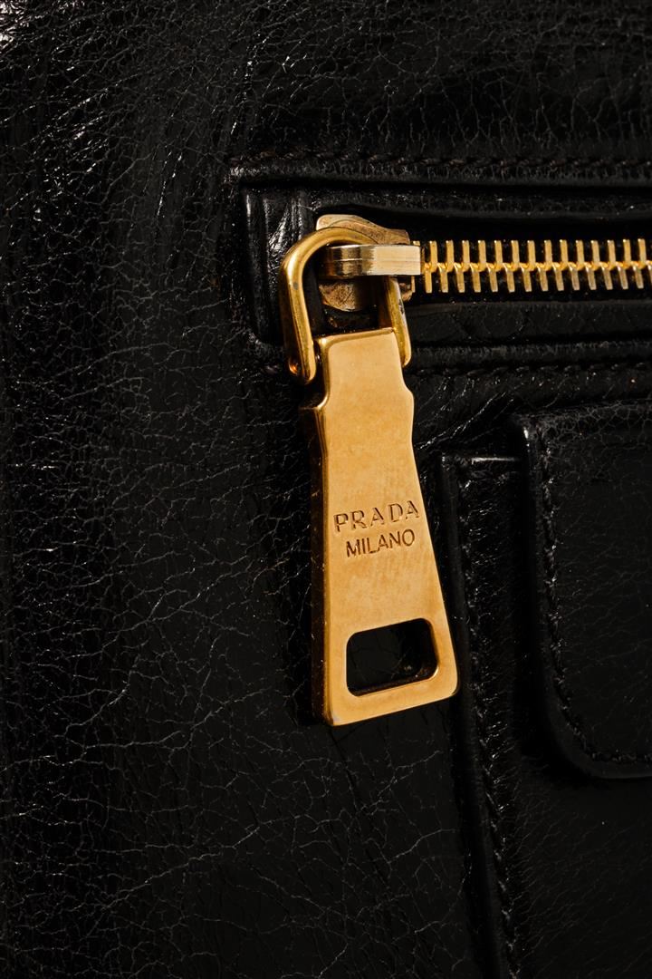 One Prada Black Leather Tote Bag. Item is sold AS-IS. All available information is listed in the description and shown in the photo. Prada black leather tote bag with gold-tone hardware, zip pocket, dual handles and logo on the front. Please note: Lining is very peely.