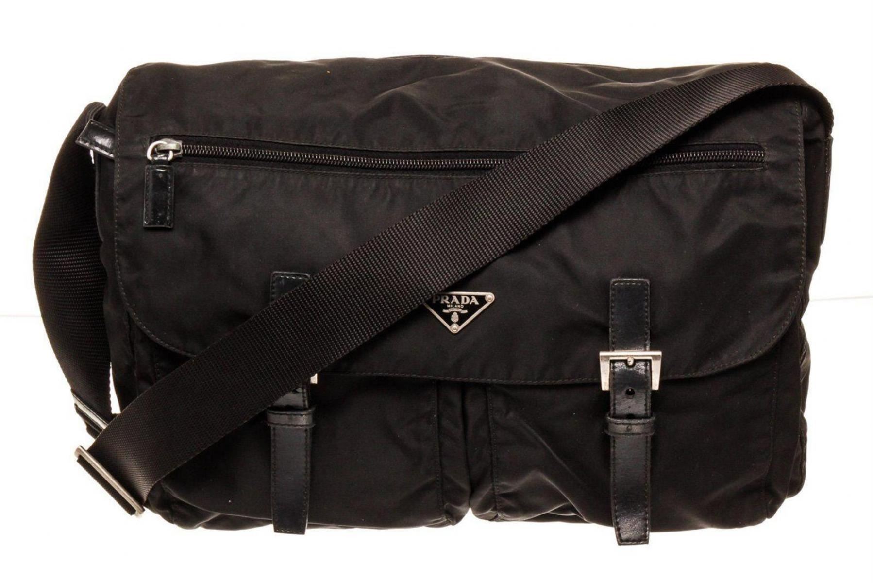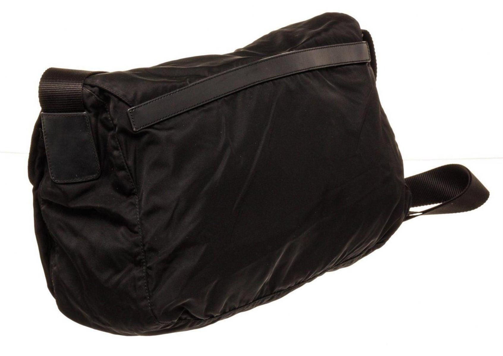 Prada Black Leather Vela Messenger Bag with gold-tone hardware, exterior zip pocket, interior slip pocket, shoulder strap and zipper closure.