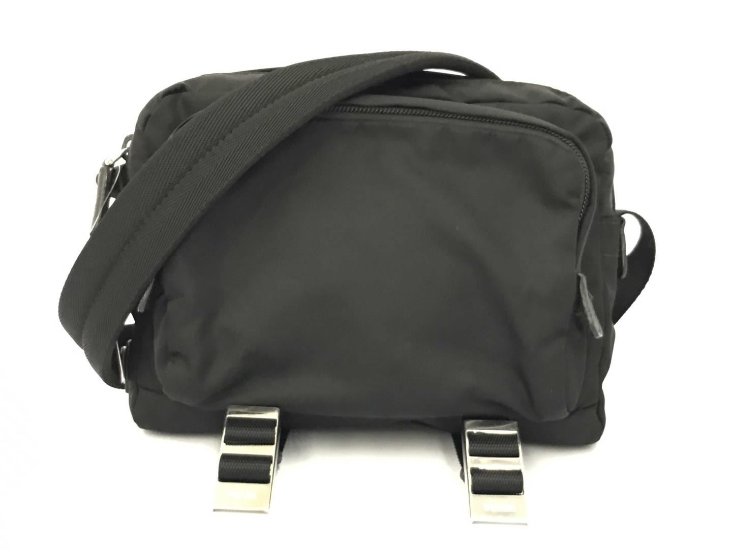 One Prada Black Nylon Crossbody Shoulder Bag. Item is sold AS-IS. All available information is listed in the description and shown in the photo. Black nylon Prada crossbody shoulder bag with black leather trim, tonal fabric lining, one zipper pocket at interior wall, large exterior pocket with zipper closure, adjustable strap and overall zip top closure.