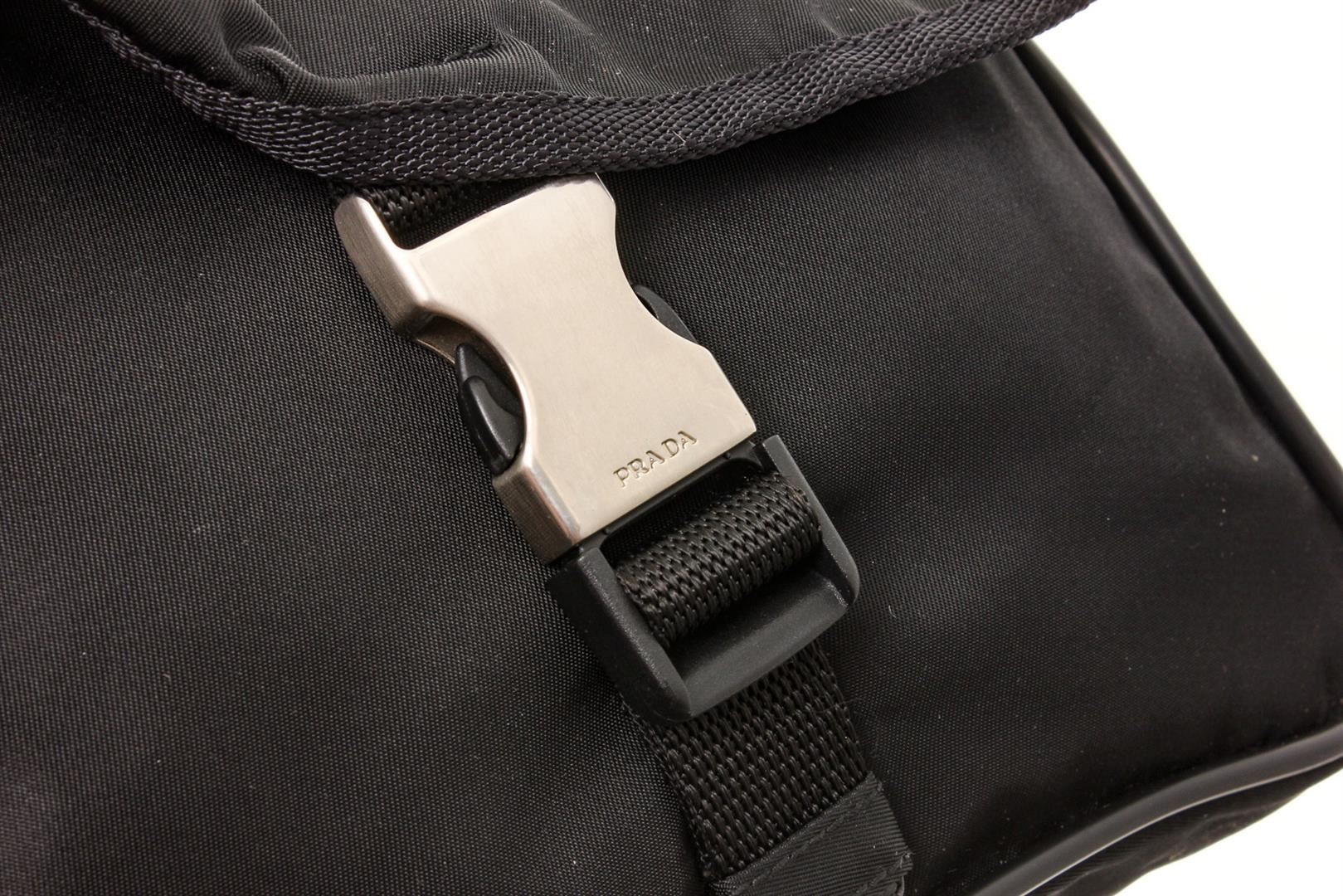 One Prada Black Nylon Crossbody Waist Bag. Black nylon Prada crossbody waist bag with silver-tone hardware, three exterior compartments; one with zipper closure. Adjustable velcro belt.