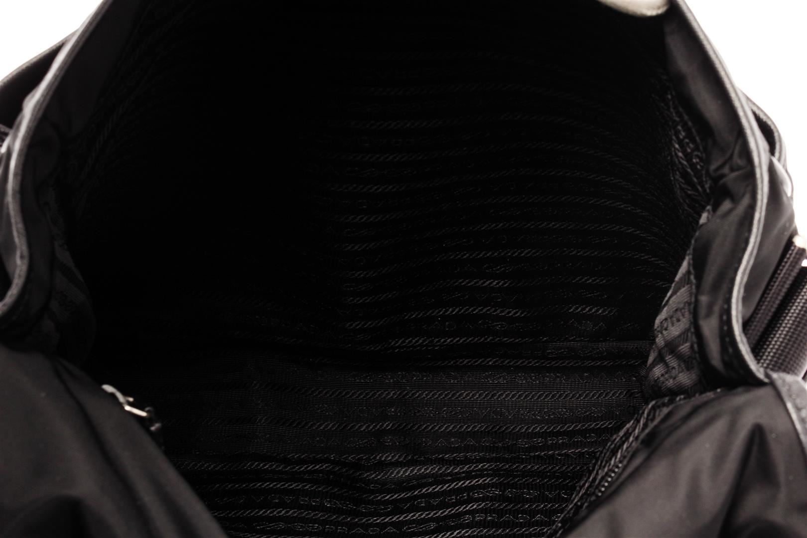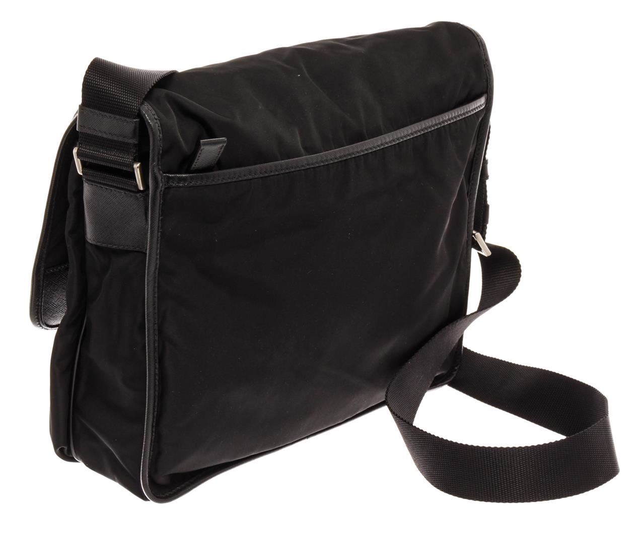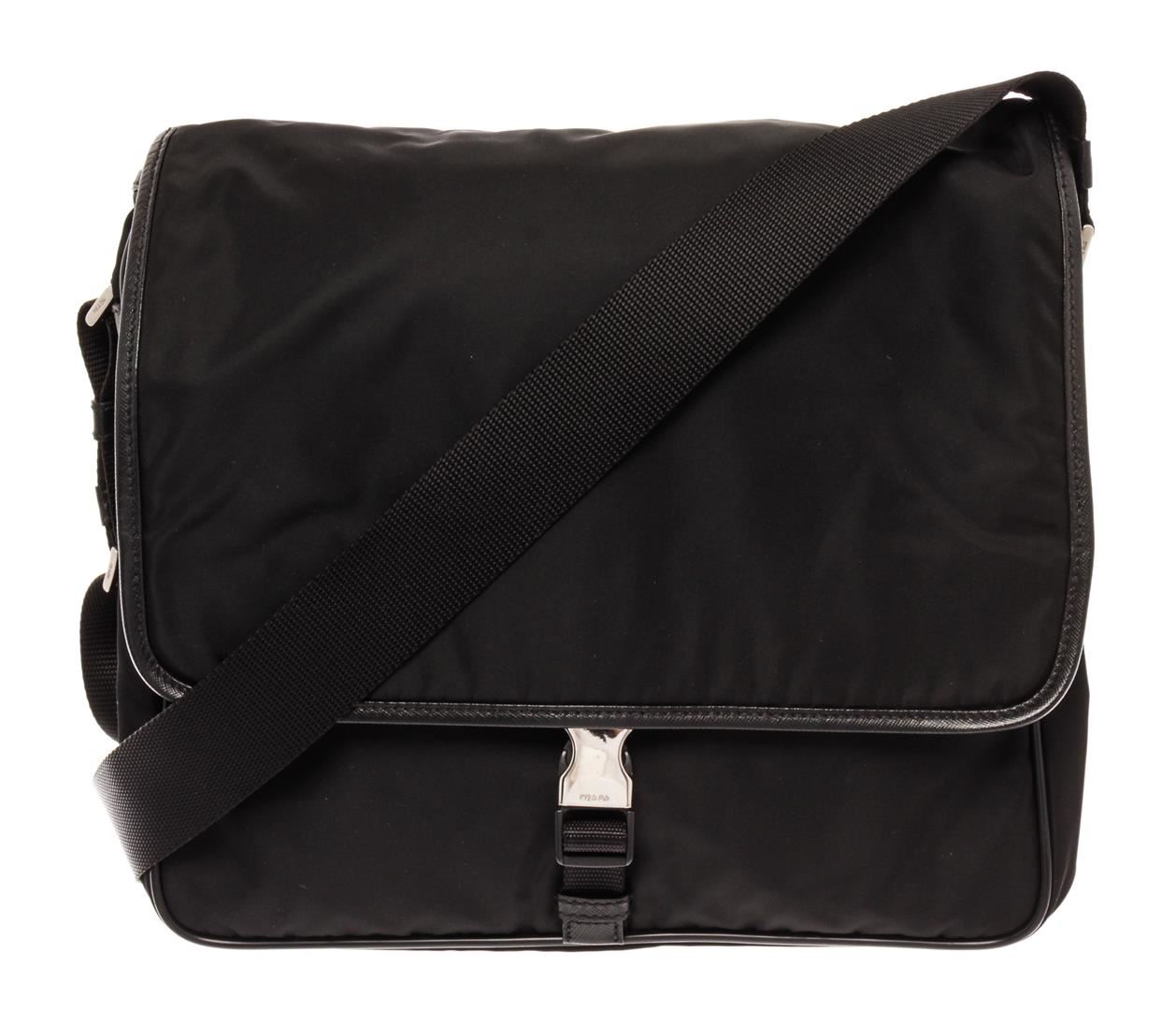 Prada Black Nylon Saffiano Trimmed Tessuto Messenger Bag. All available information is listed in the description and shown in the photos. Prada Black Nylon Saffiano Trimmed Tessuto Messenger Bag with Black Nylon, Silver-Tone Hardware, Single Adjustable Shoulder Strap, Grosgrain Trim & Single Exterior Pocket, Logo Jacquard Lining, Three Interior Pockets, Buckle Closure at Front. Height: 10.25", Width: 12.25", Depth: 2.75" / 26.03 x 31.11 x 6.98 CM