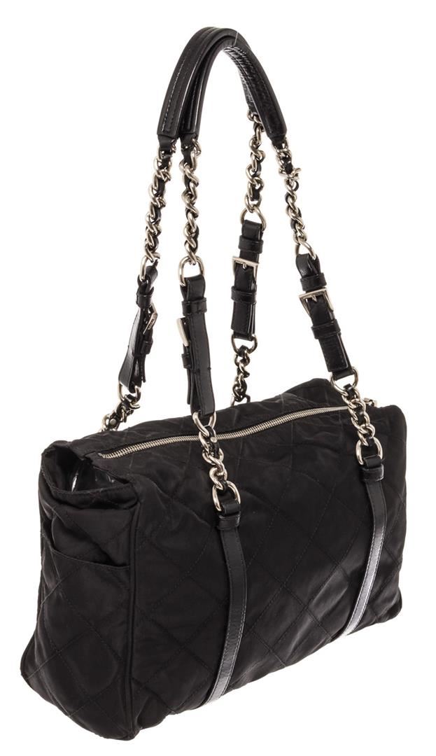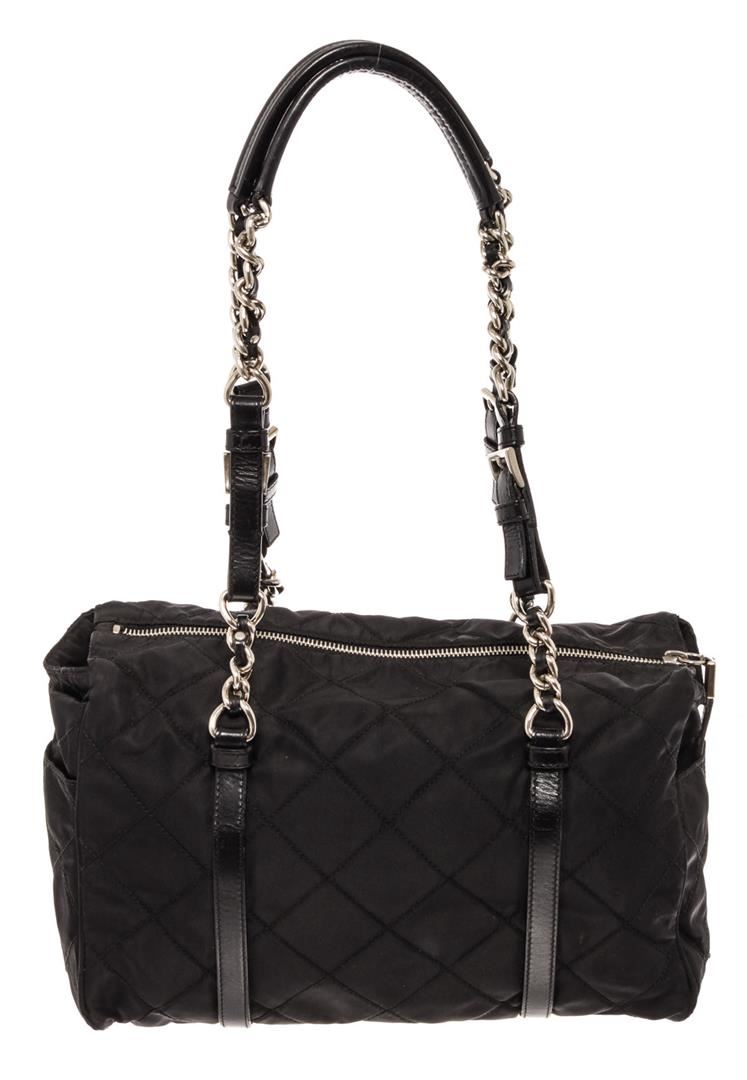 One Prada Black Quilted Tessuto Nylon Chain Small Shoulder Bag. Item is sold AS-IS. All available information is listed in the description and shown in the photo. Prada Small Shoulder Bag features black quilter Tessuto nylon with silver-tone hardware, double shoulder straps with chain and leather details, two rear exterior open pockets, zipper closure and black signature Prada textile-lined interior.