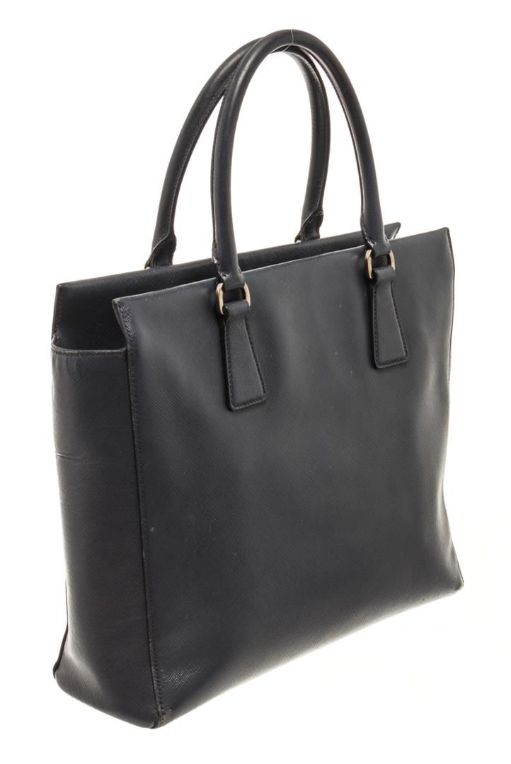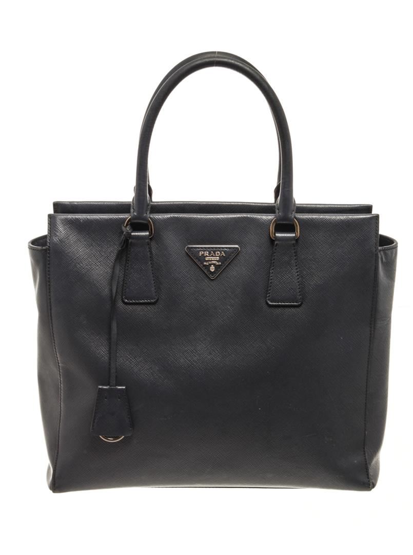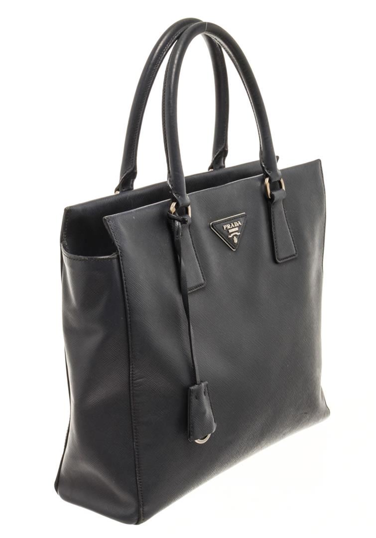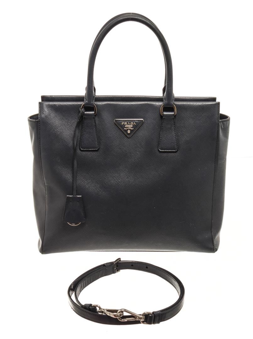 One Prada Black Saffiano 2 Way Tote Bag. Item is sold AS-IS. All available information is listed in the description and shown in the photo. Prada Black Saffiano 2 Way Tote Bag with top handle bag, clochette, fabric lining, interior pockets and silver hardware.