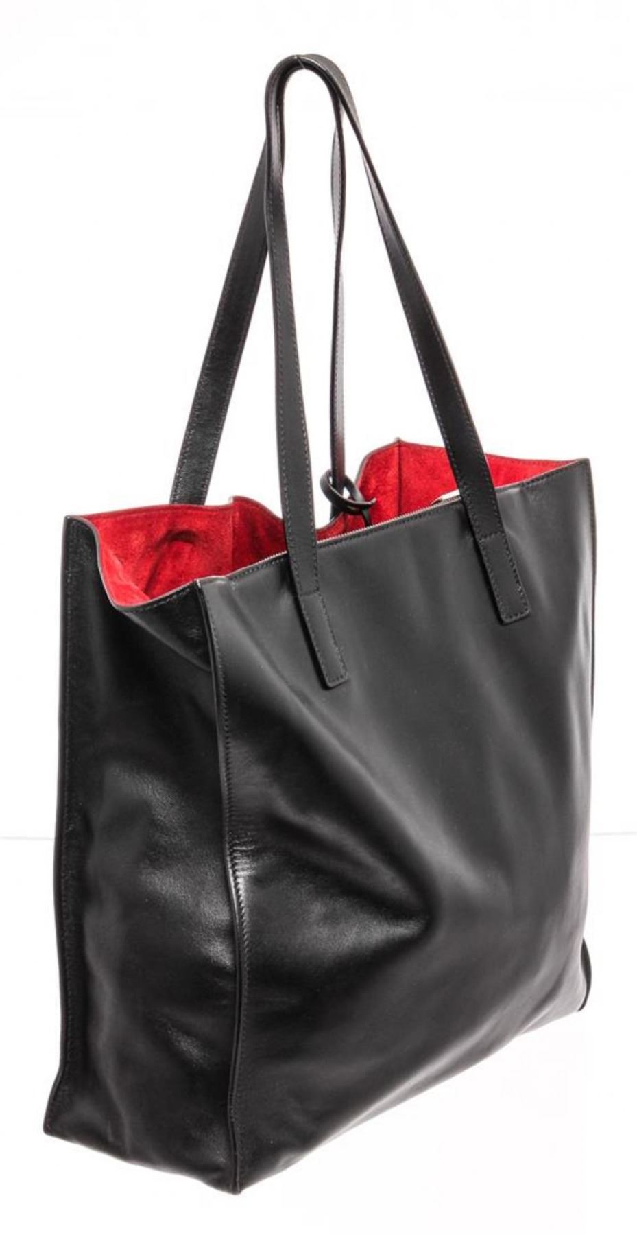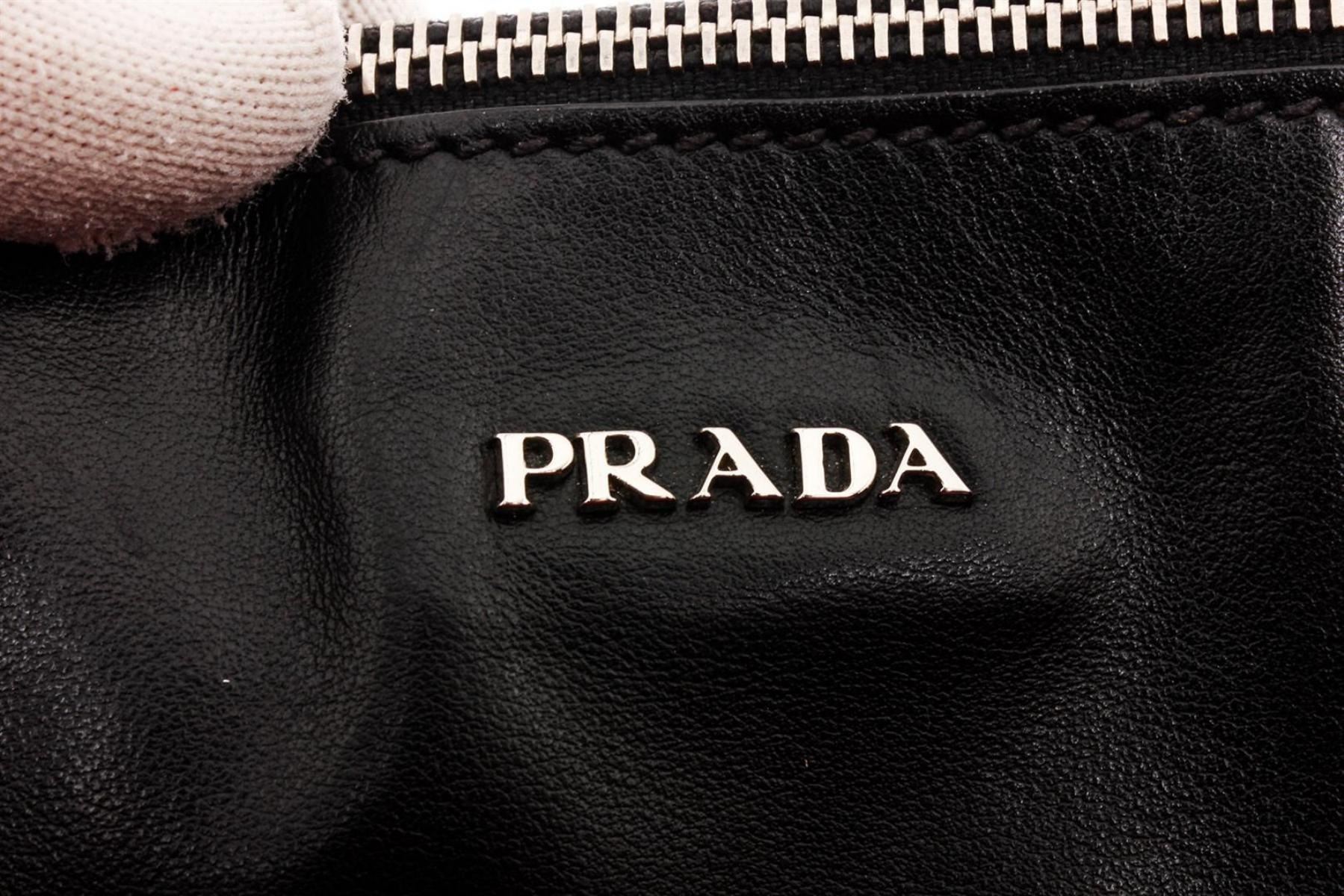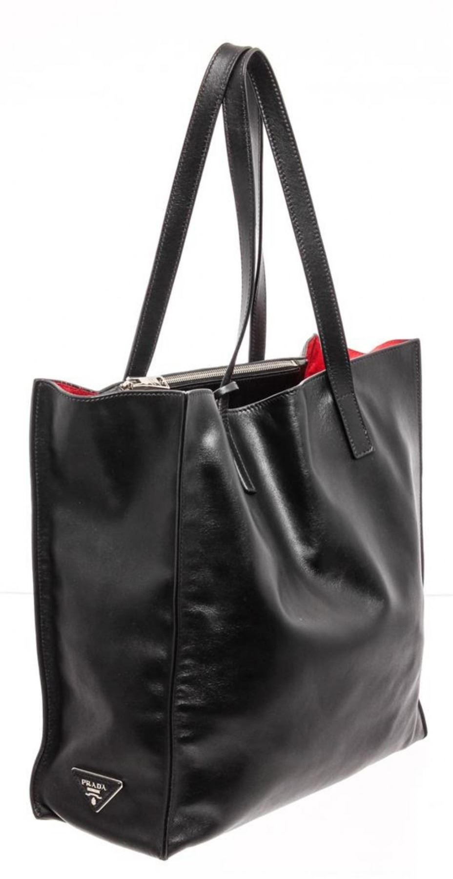 Prada black soft calfskin leather large shoulder bag with silver-tone hardware, dual flat shoulder straps, red suede lining, one interior pocket with zip closure and overall open top.