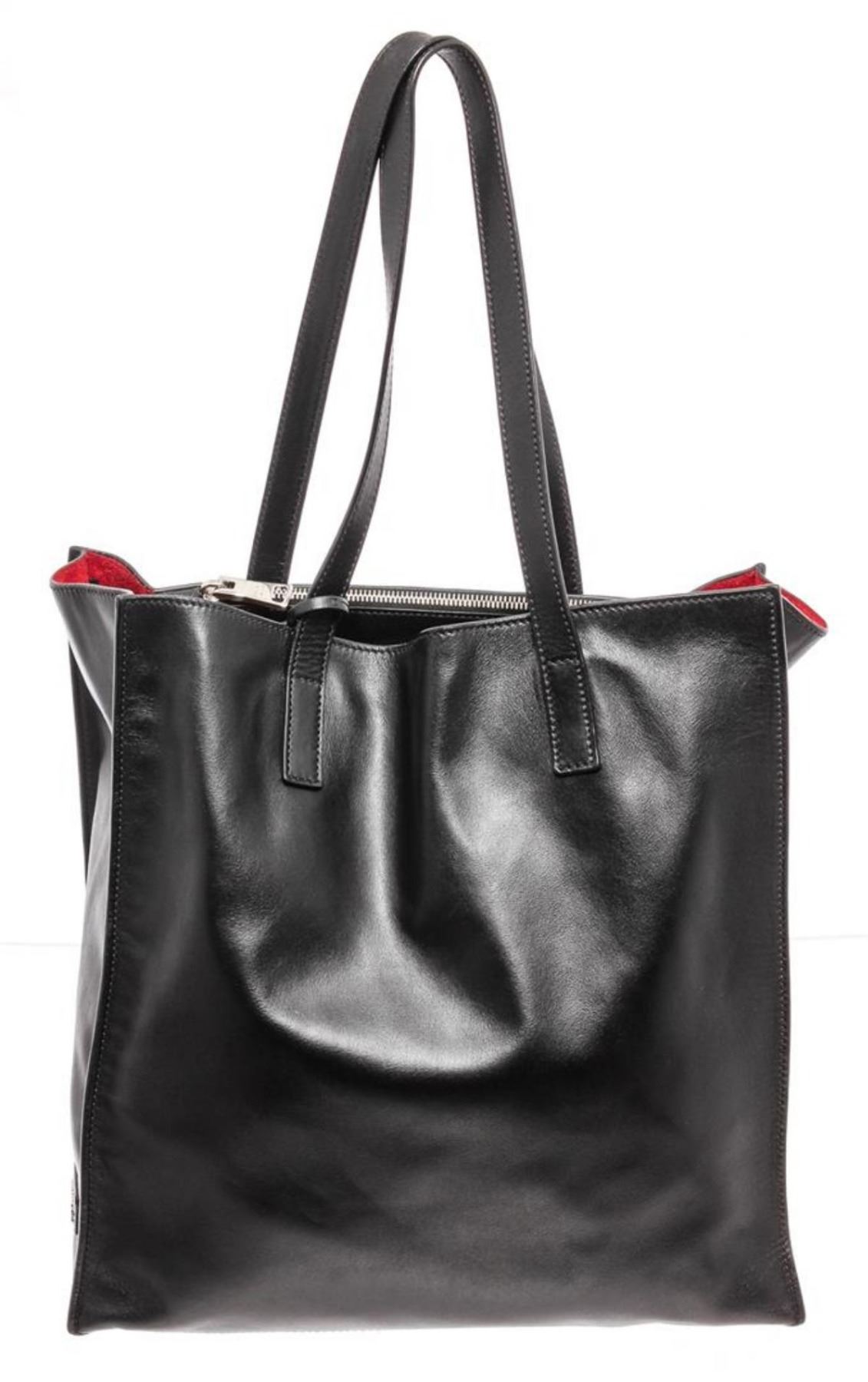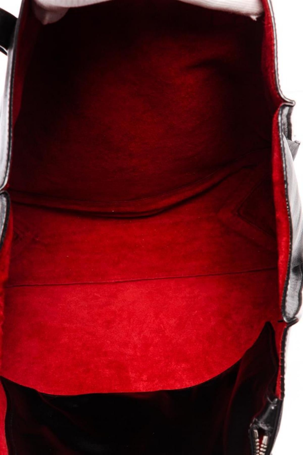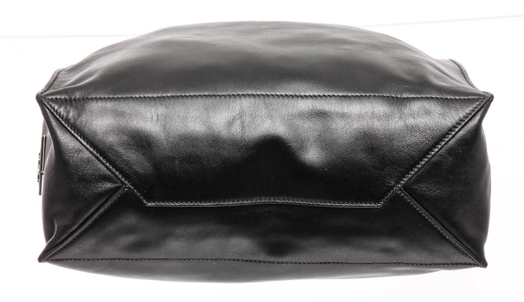 Prada black soft calfskin leather large shoulder bag with silver-tone hardware, dual flat shoulder straps, red suede lining, one interior pocket with zip closure and overall open top.