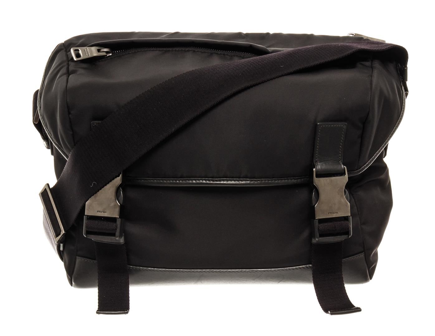 One Prada Black Tessuto Double Buckle Flap Bag. Item is sold AS-IS. All available information is listed in the description and shown in the photo. Prada Black Nylon Tessuto Double Buckle Flap Bag with silver tone hardware, black leather trim, black nylon lining, outer zipper pocket, one zipped pocket, and buckle closures.
