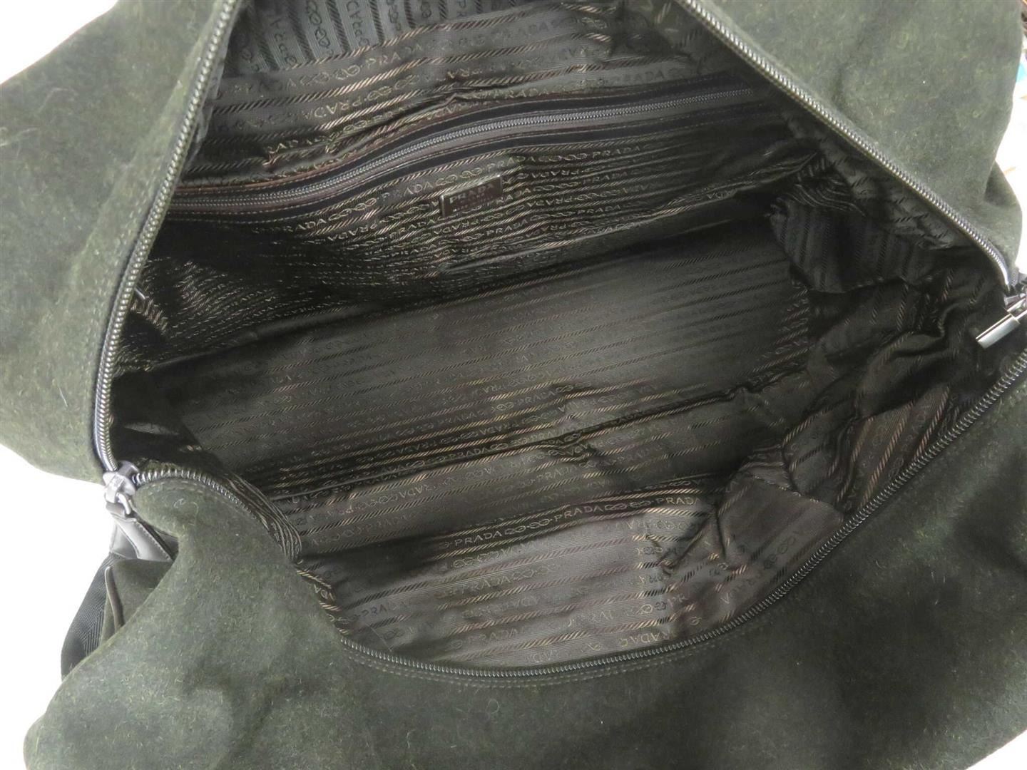 One Prada Black Wool Boston Bag. Item is sold AS-IS. All available information is listed in the description and shown in the photo. Black wool Prada boston bag with silver-tone hardware, dual flat handles, black woven lining, long strap, pochette, padlock, and tag, with single zip pocket at interior wall, and zip closure at top. 14"x 4"x 8.5"xHandle Drop: 8.5"/35.6cmx10.2cmx21.6cmxHandle Drop:21.6cm