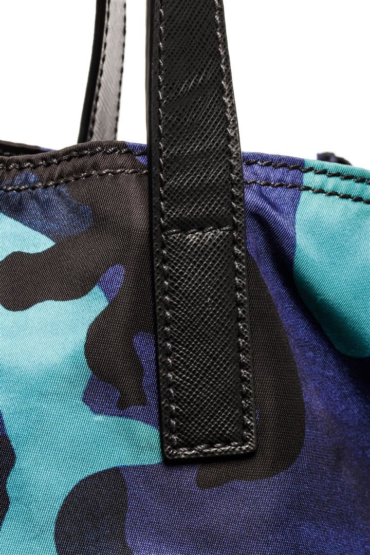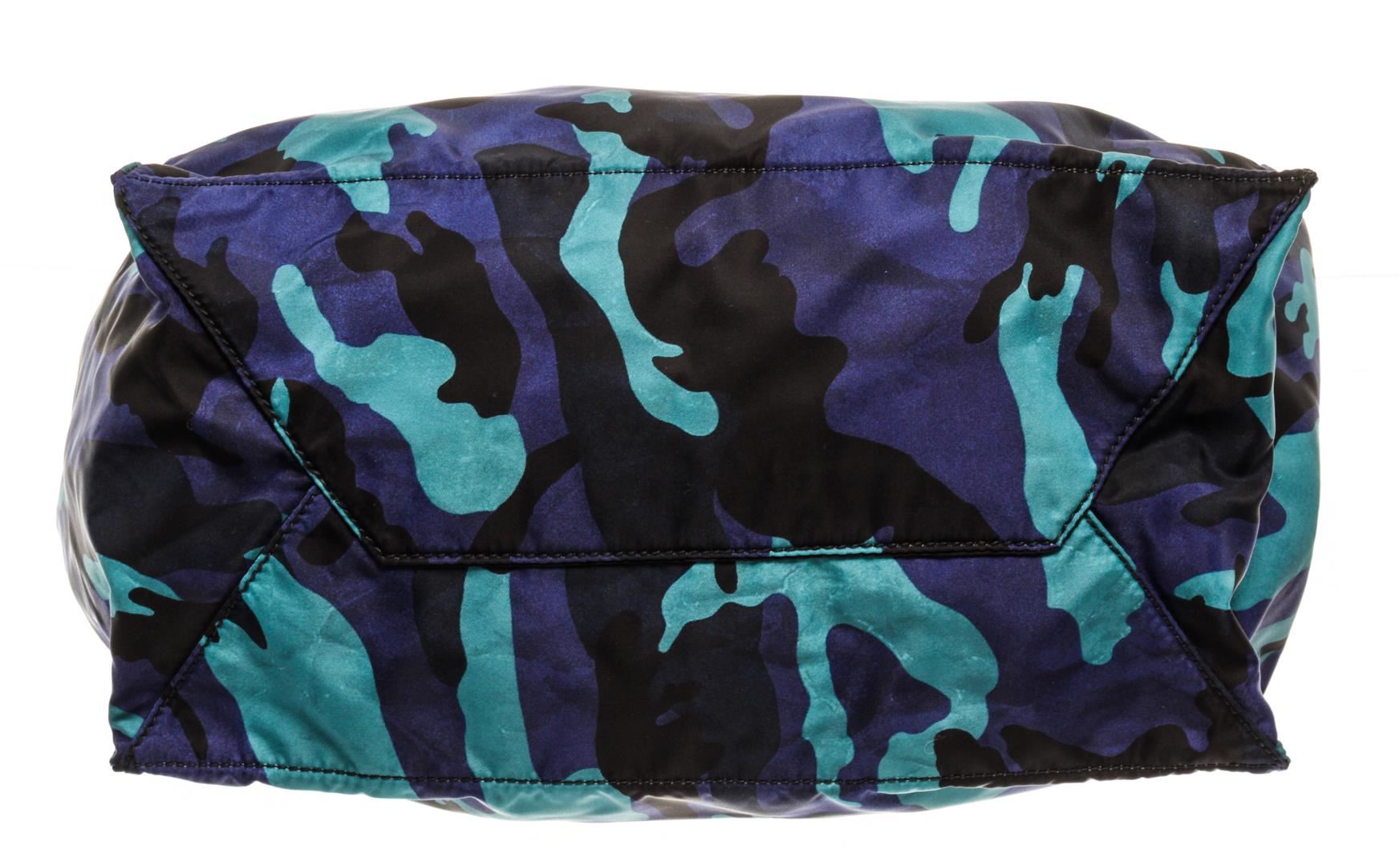 One Prada Blue Camo Nylon Tote Bag. Item is sold AS-IS. All available information is listed in the description and shown in the photo. Prada blue camo nylon tote bag with top handles, snap button closure, black nylon lining, and one interior zip pocket.