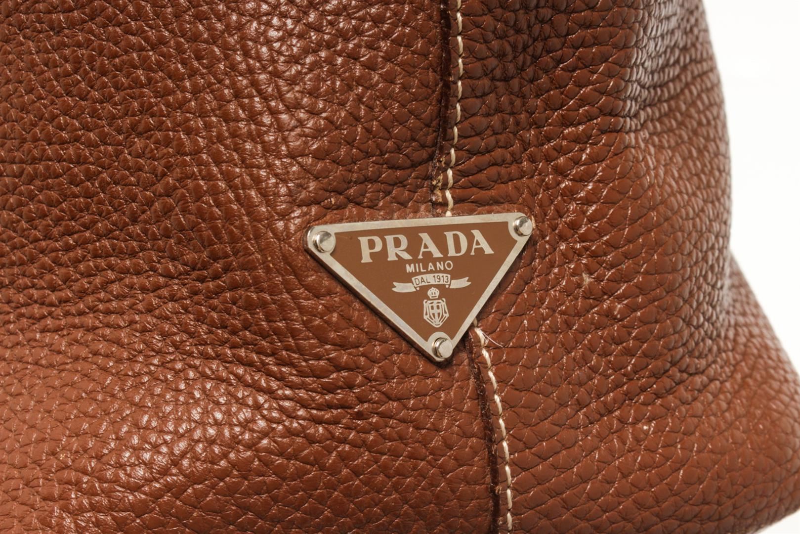 One Prada Brown Leather Vitello Daino Shoulder Bag. Item is sold AS-IS. All available information is listed in the description and shown in the photo. Prada Brown Leather Vitello Daino Shoulder Bag with silver-tone hardware, dual flat shoulder straps with buckle detail, white contrast stitching, an open top and brown logo jacquard lining. Height: 12" Width: 10" Depth: 3.5", Handle Drop: / 30.48 x 25.4 x 8.89 Cm