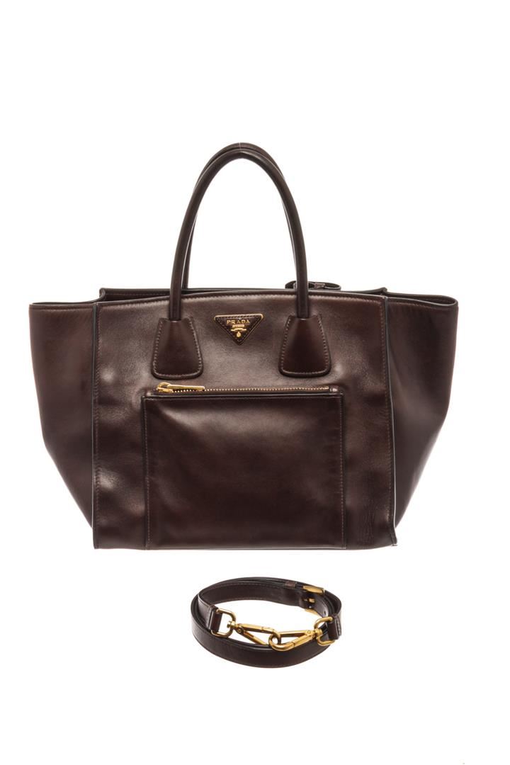 Prada Brown Nero Glace Calf Leather Double Tote Bag. All available information is listed in the description and shown in the photos. Prada Brown Nero Glace Calf Leather Double Tote Bag with gold-tone hardware, logo jacquard lining, snap closure at top. Height: 9.5", Width: 12", Depth: 7.5" / 24.13 x 30.48 x 19.05 CM