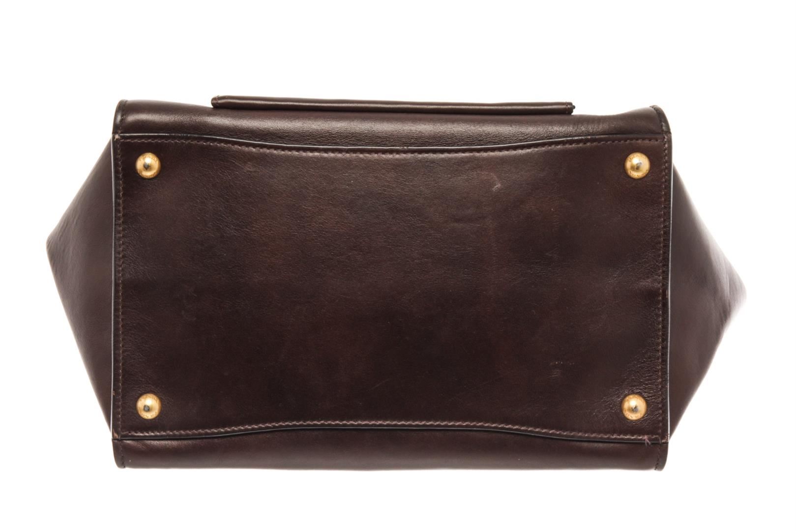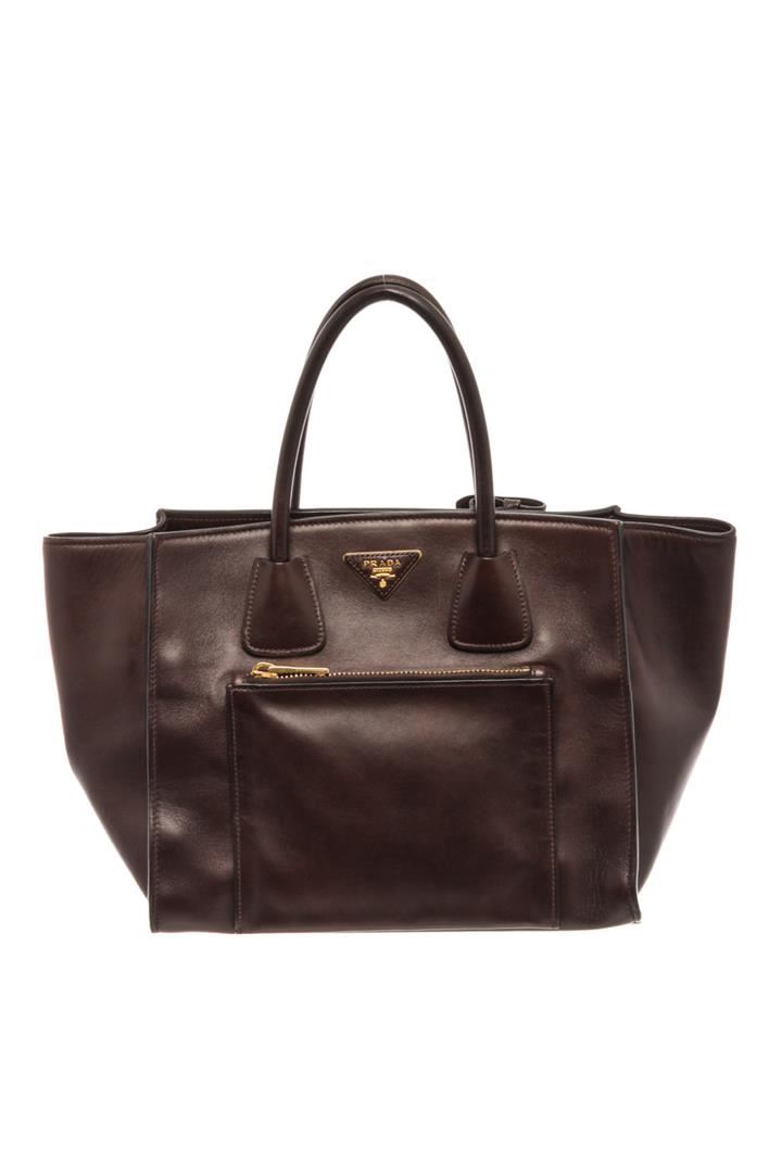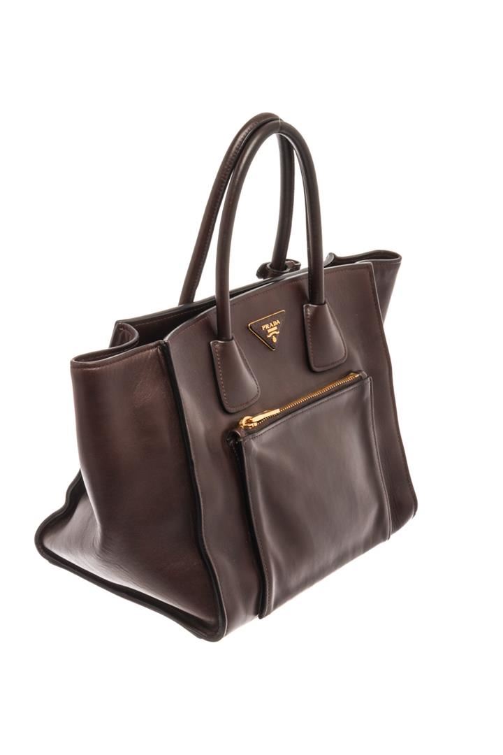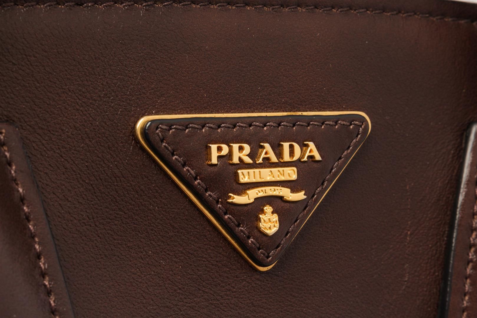 Prada Brown Nero Glace Calf Leather Double Tote Bag. All available information is listed in the description and shown in the photos. Prada Brown Nero Glace Calf Leather Double Tote Bag with gold-tone hardware, logo jacquard lining, snap closure at top. Height: 9.5", Width: 12", Depth: 7.5" / 24.13 x 30.48 x 19.05 CM