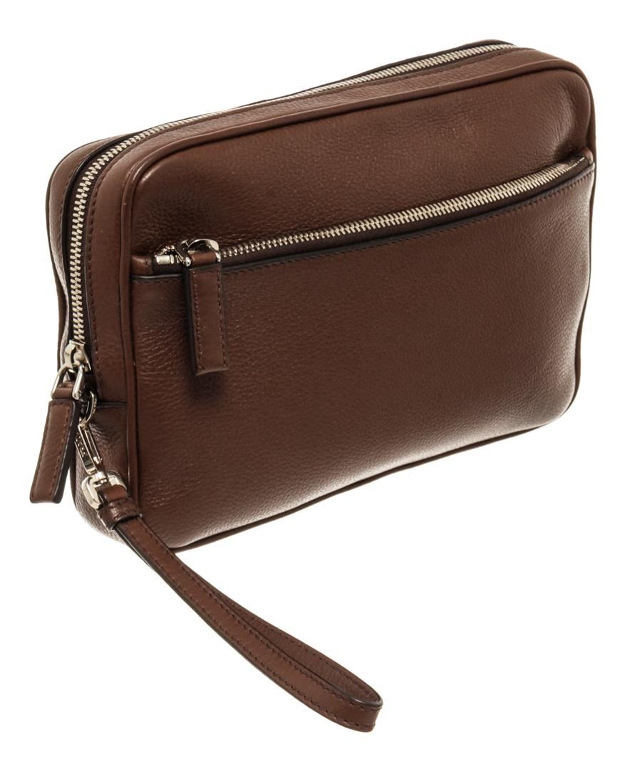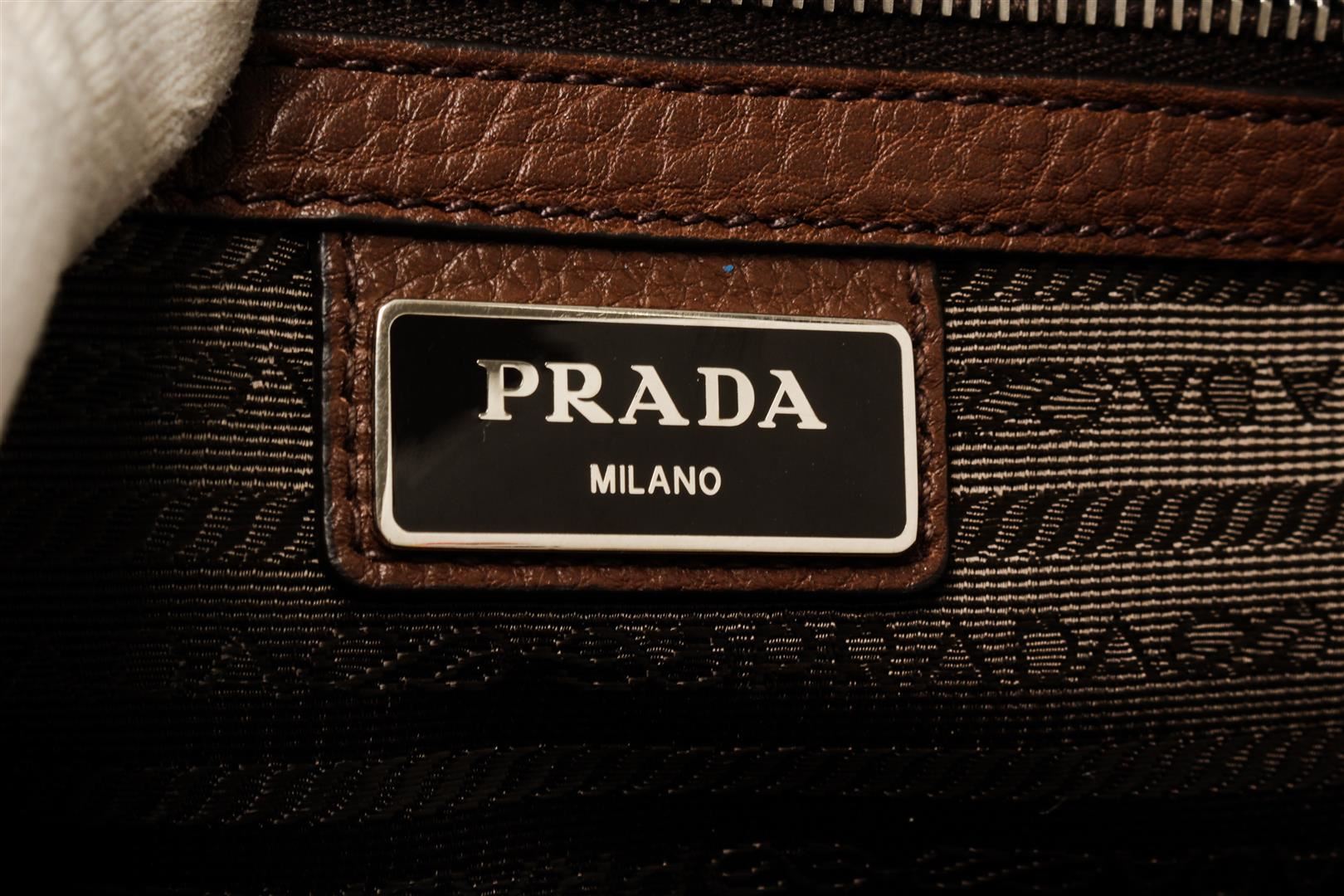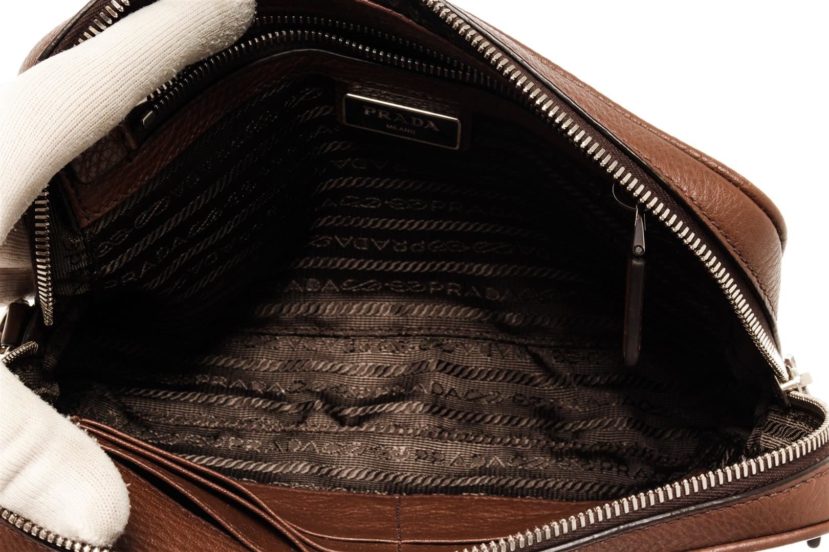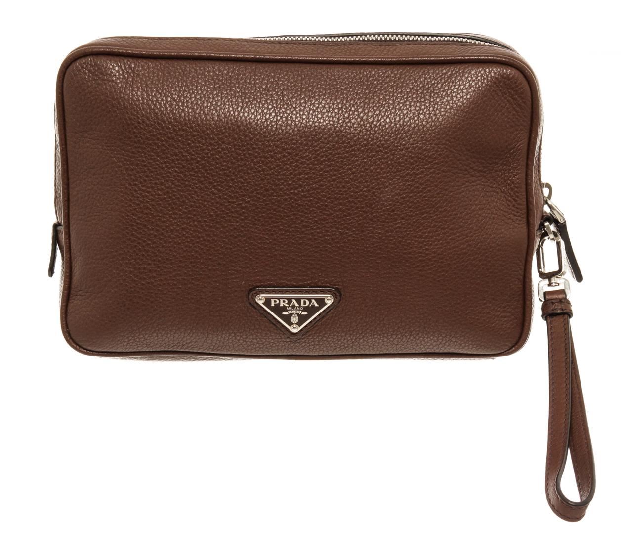 One Prada Brown Vitello City Leather Wristlet Zip Pouch. Item is sold AS-IS. All available information is listed in the description and shown in the photo. Prada Brown Vitello City Leather Wristlet Zip Pouch features silver-tone hardware, black canvas lining, single exterior and interior zip pocket, interior brown leather card holders, and zip closure.