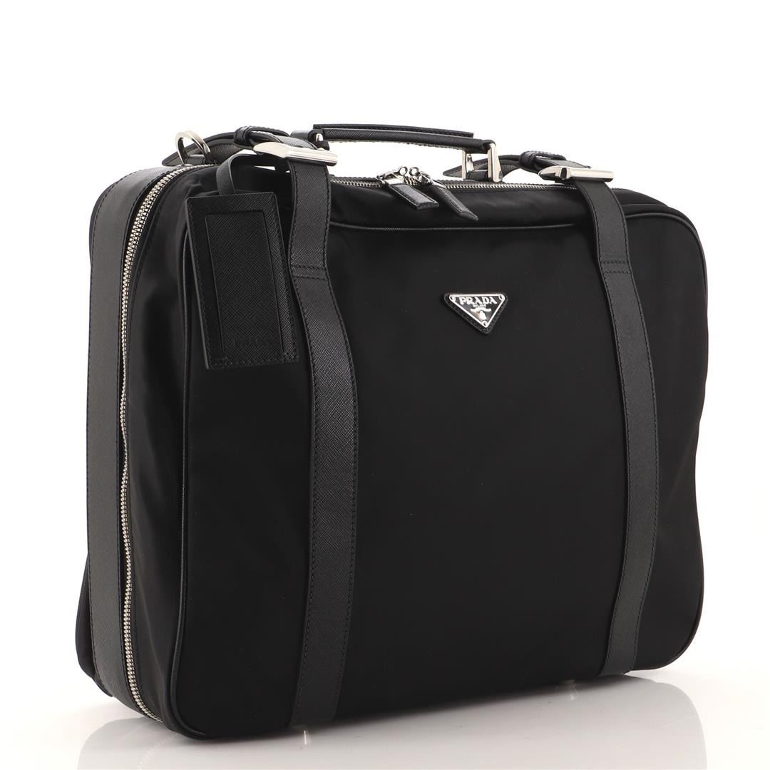 One Prada Convertible Buckle Suitcase Tessuto and Saffiano Leather. Item is sold AS-IS. All available information is listed in the description and shown in the photo. Prada Convertible Buckle Suitcase Tessuto and Saffiano Leather. Creasing, minor wear and marks on exterior, scratches and tarnish on hardware.