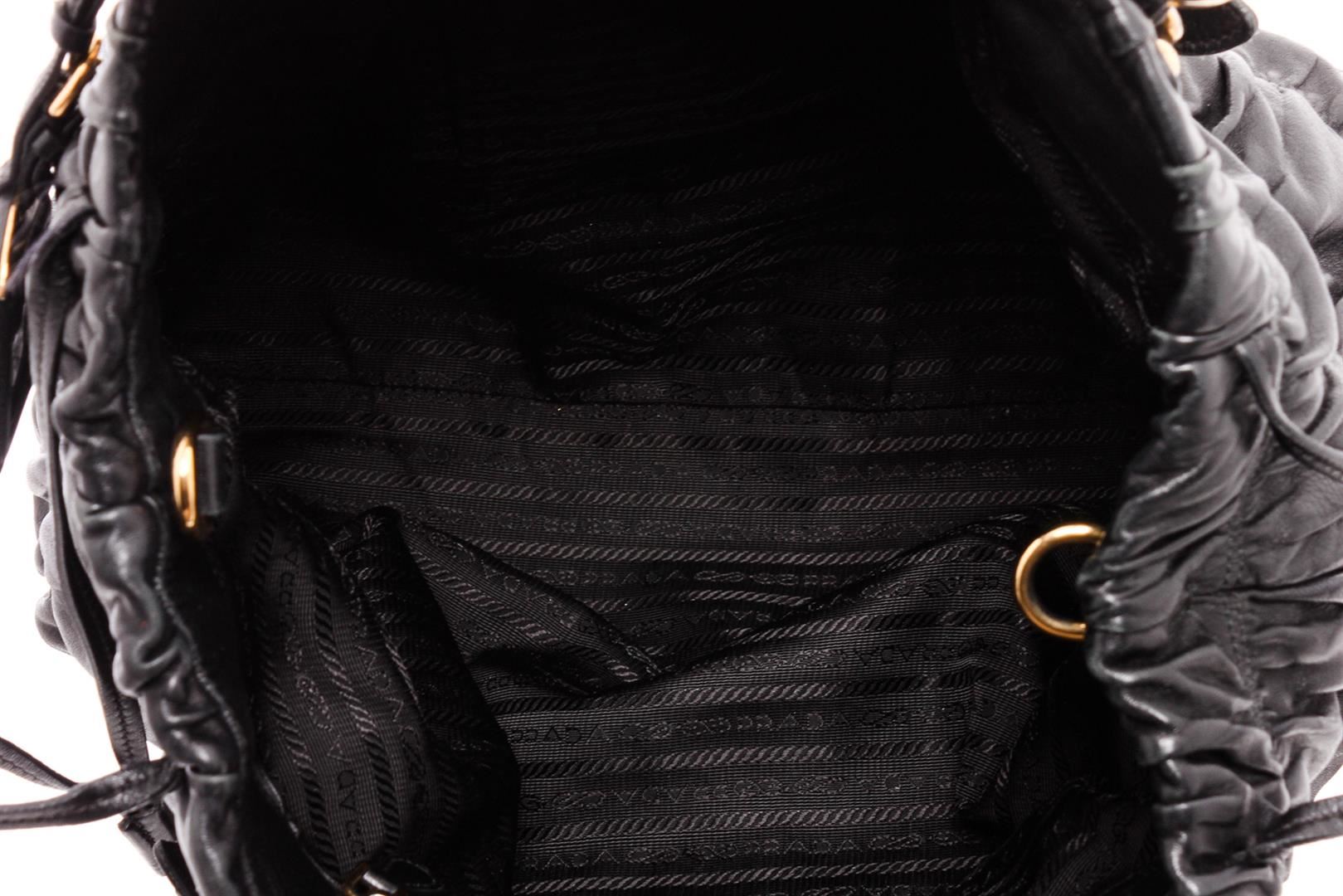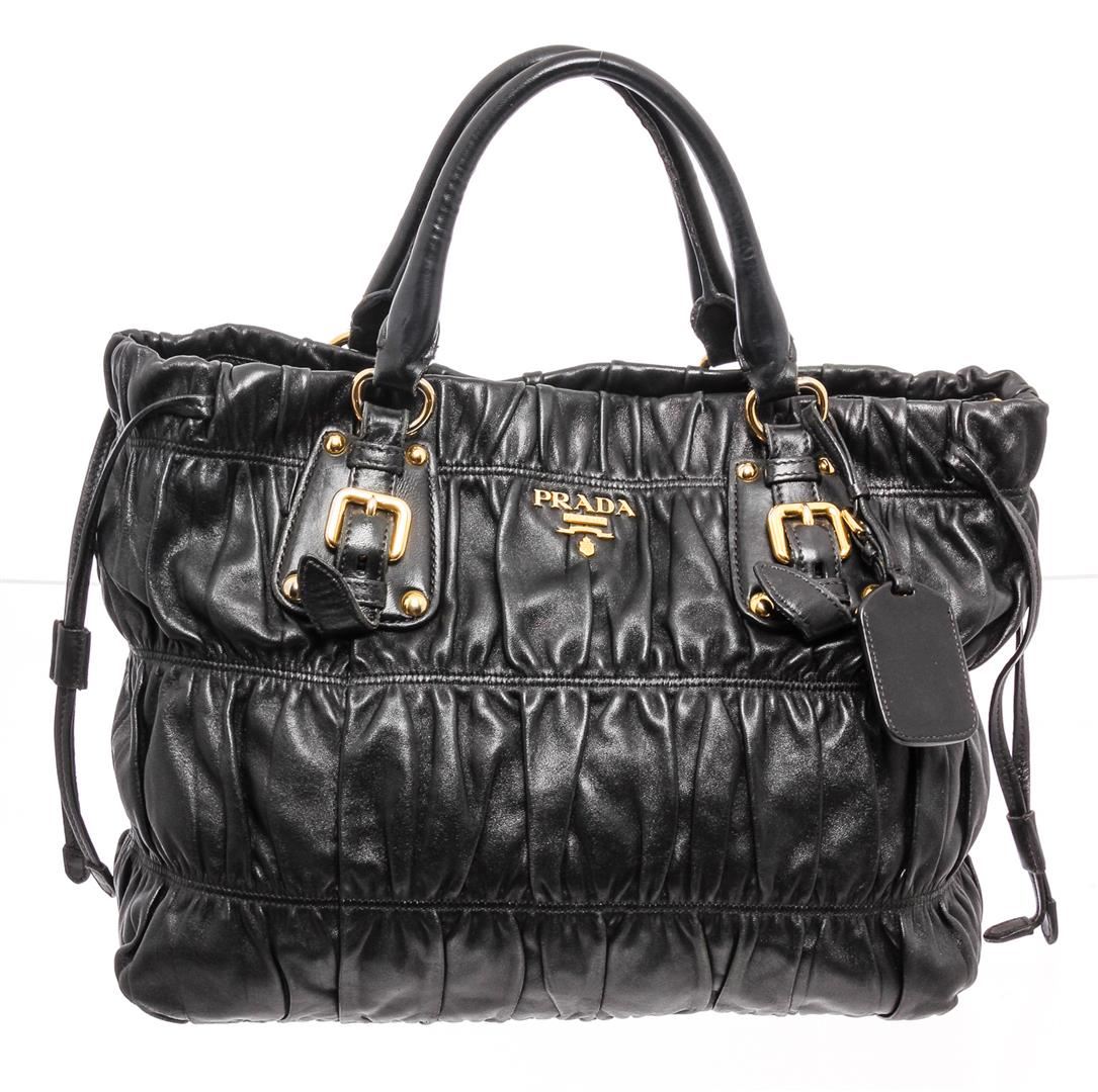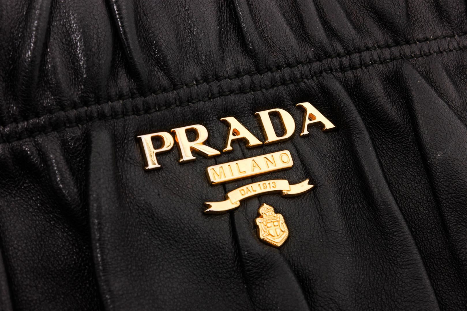 Prada dark blue nappa gaufre leather, gold-tone hardware, and snap closure. Inner dark blue Prada logo lining and inner wall zip pocket. Please note: the longer attachable strap is missing and does NOT come with the bag.