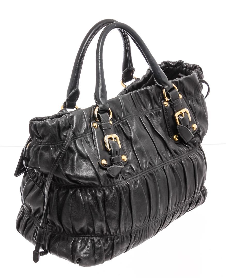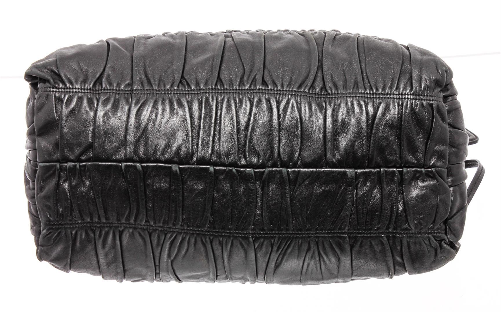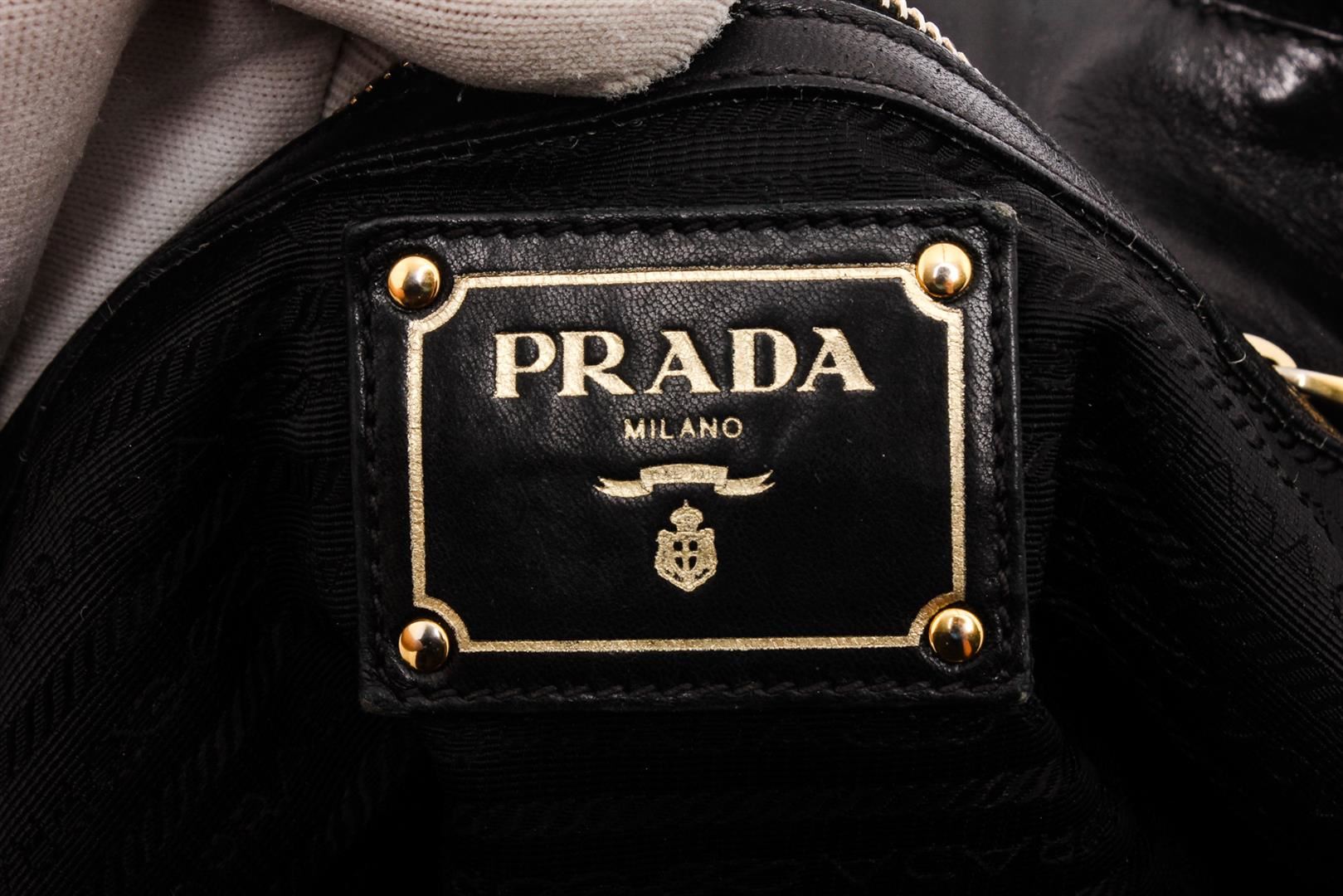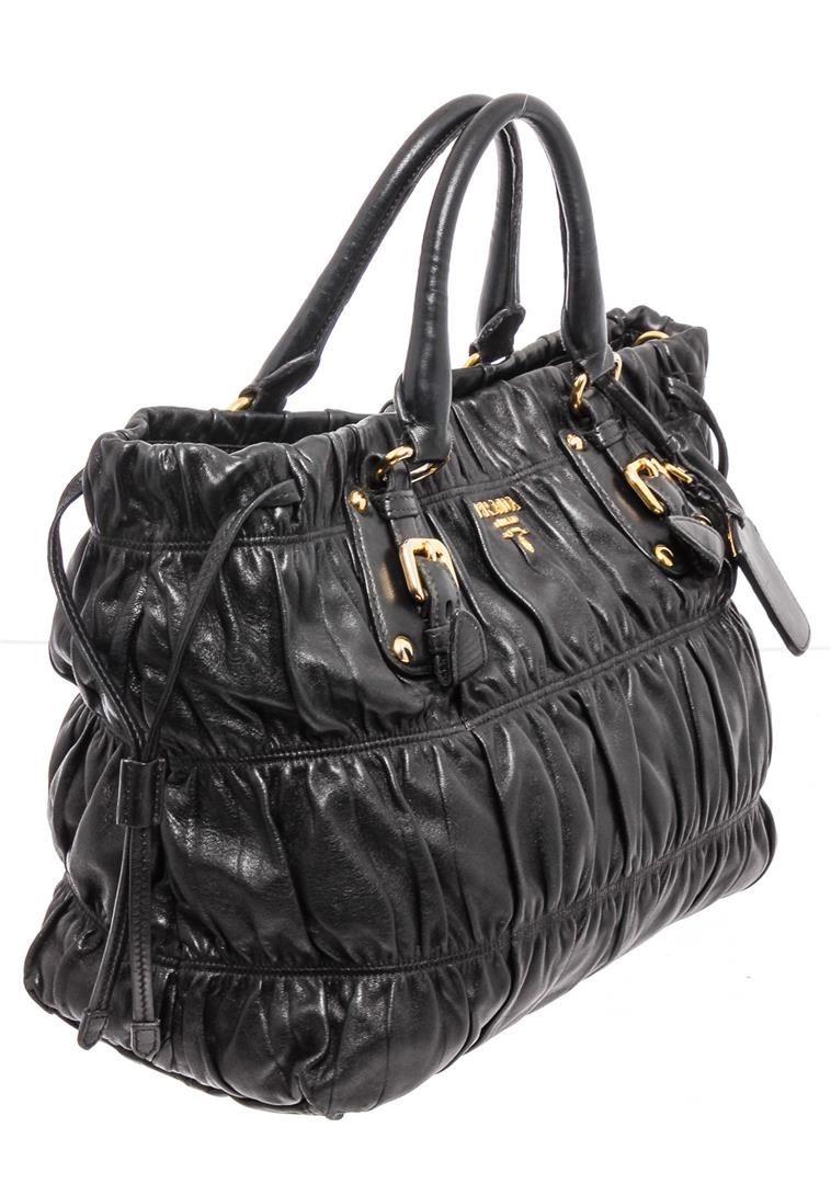 Prada dark blue nappa gaufre leather, gold-tone hardware, and snap closure. Inner dark blue Prada logo lining and inner wall zip pocket. Please note: the longer attachable strap is missing and does NOT come with the bag.
