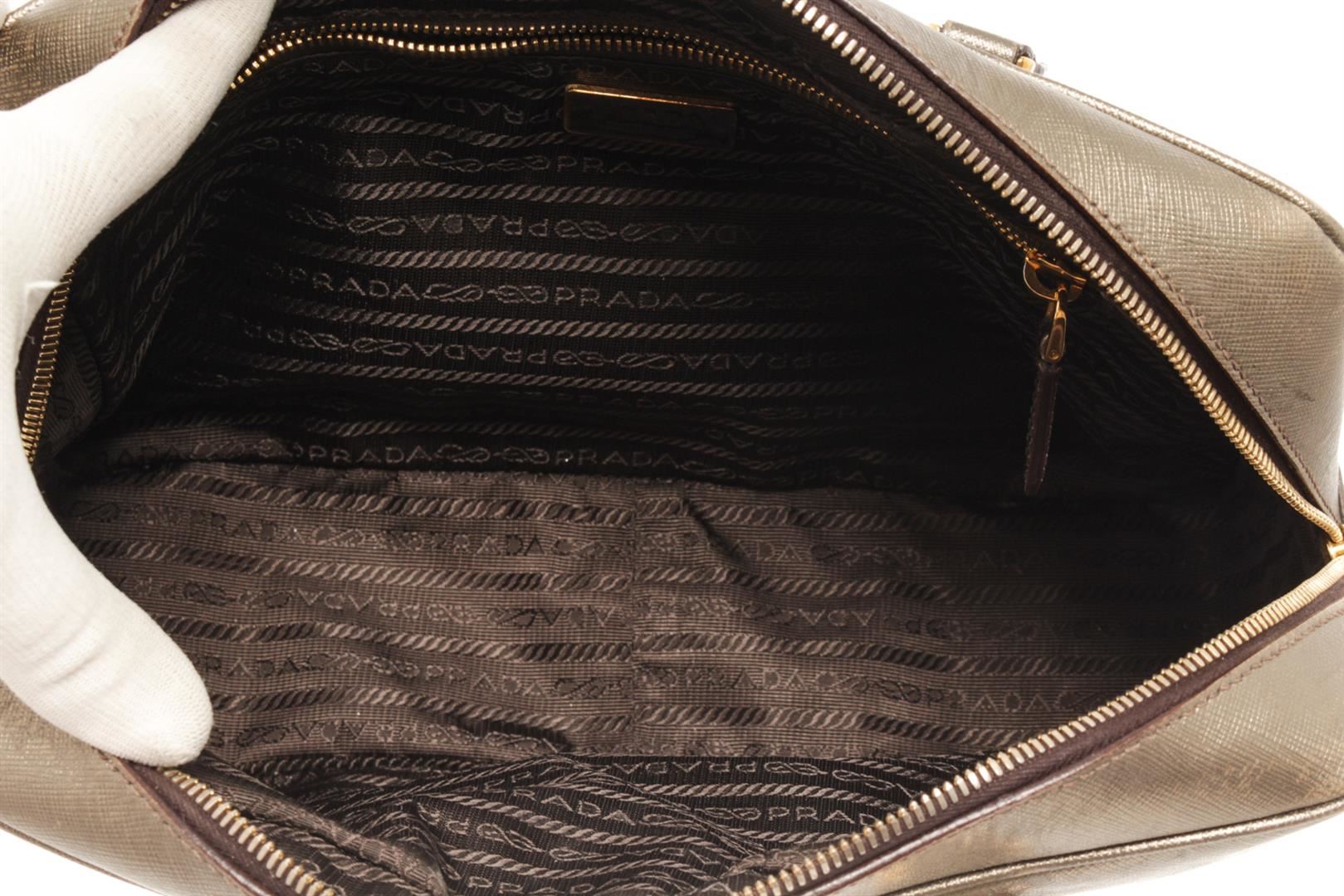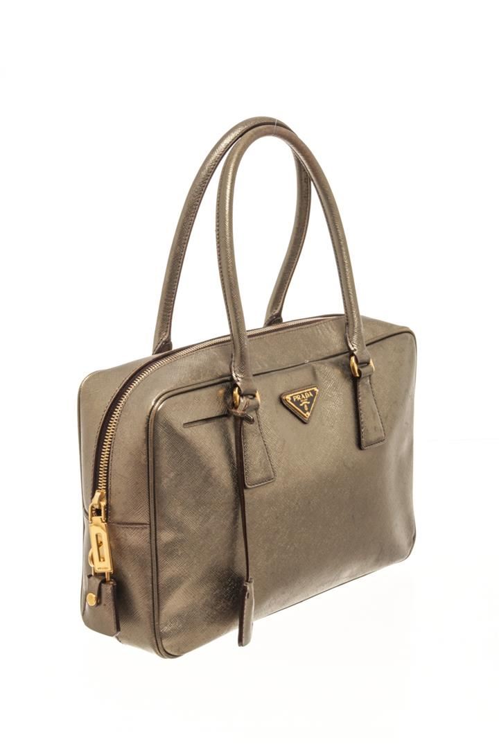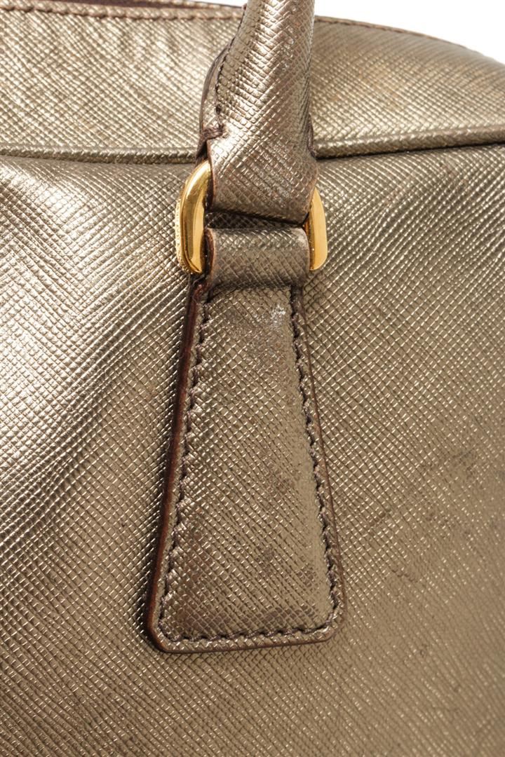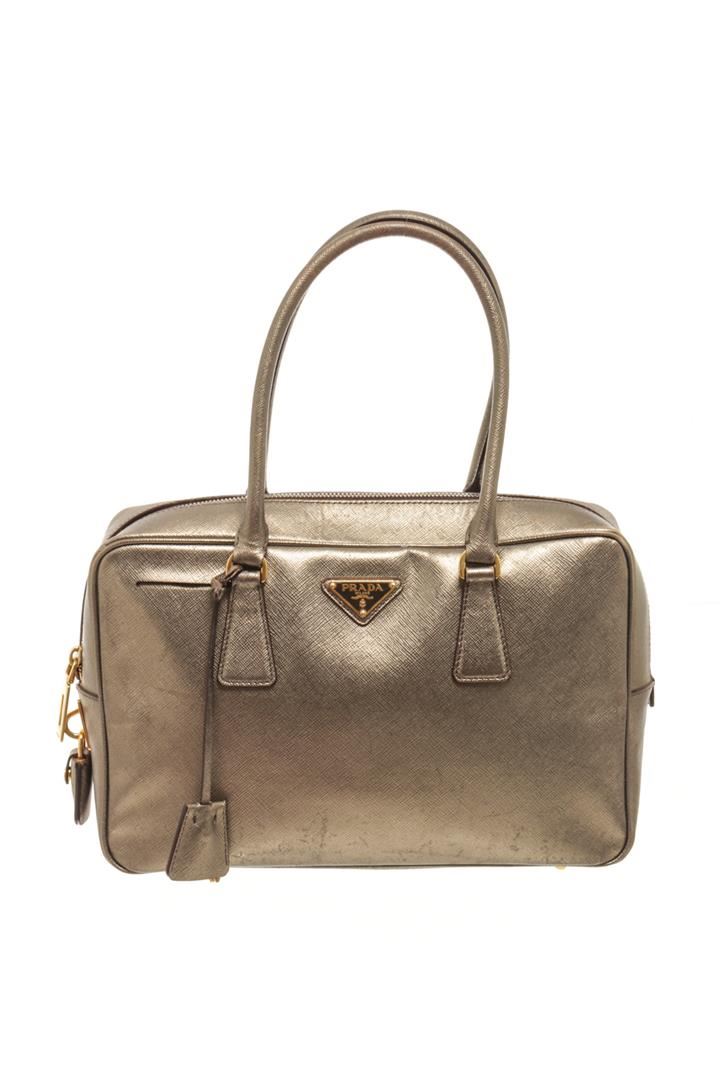 One Prada Gold Saffiano Lux Leather Bauletto Satchel Bag. Item is sold AS-IS. All available information is listed in the description and shown in the photo. Prada Gold Saffiano Lux Leather Bauletto Satchel Bag with the beautiful bag features splendid details in the form of the gleaming golden hue, dual top handles, a dangling leather clochette, and protective metal feet in gold-tone. the top zip closure opens to a nylon-lined interior. There is a stain on the back of the bag, some white marks and scratches. Please refer to photos. Height: 6.29" Width: 3.54" Depth: 10.03", Handle Drop: 3.54" / 16 x 9 x 25.5 Cm