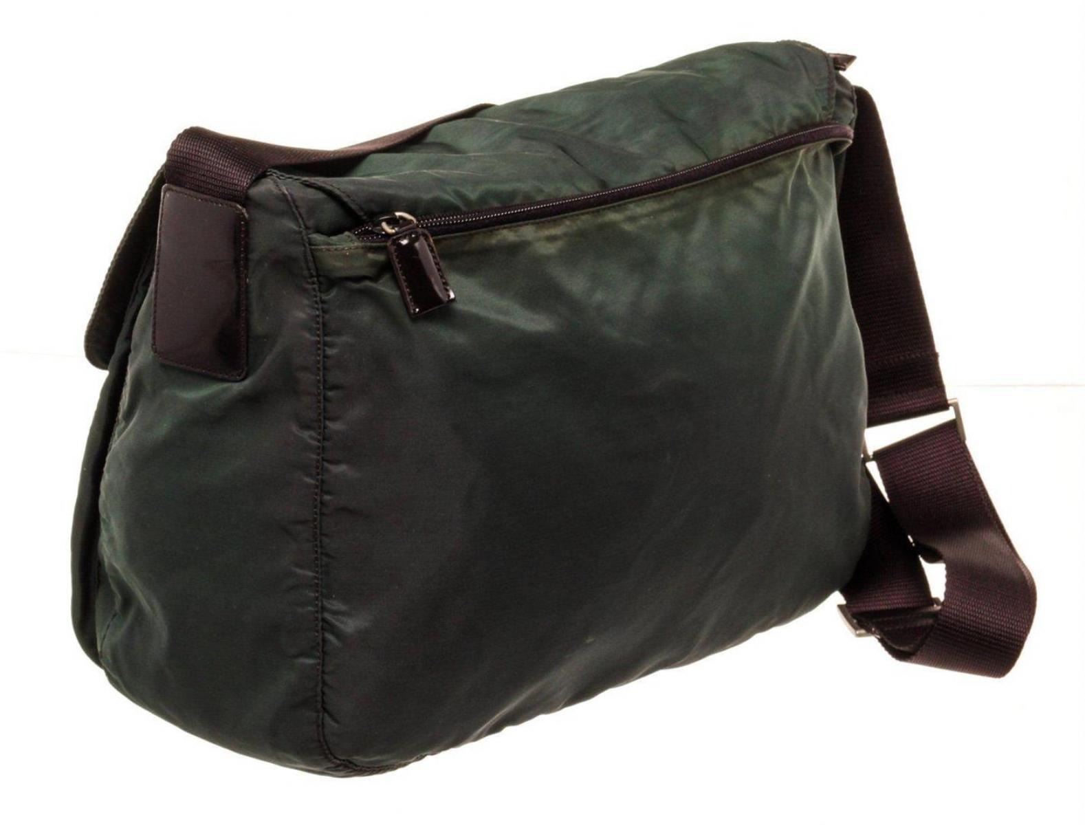 Prada Green Canvas Messenger Shoulder Bag with material canvas, gold-tone hardware, exterior zip pocket, interior slip pocket, shoulder strap and zipper closure.
