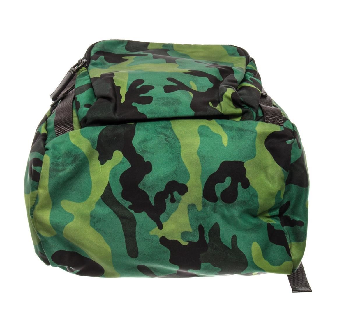 One Prada Green Printed Camo Tessuto Large Front Pocket Double Buckle Backpack. Item is sold AS-IS. All available information is listed in the description and shown in the photo. Prada Large Backpack features green multicolor camouflage Tessuto nylon, black nylon top handle, front pocket with zipper, two black padded shoulder strap that can be adjusted, silver-tone hardware, drawstring closure for the main compartment with flap on top completed with double buckles and black canvas lining. Height 14", Width 10.5", Depth 6", Strap Drop 6-18"