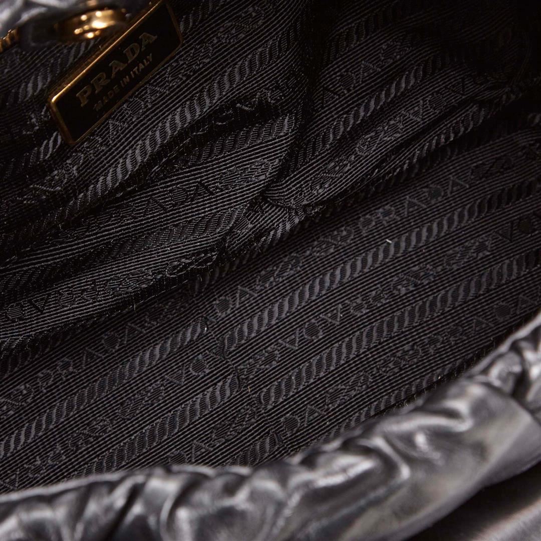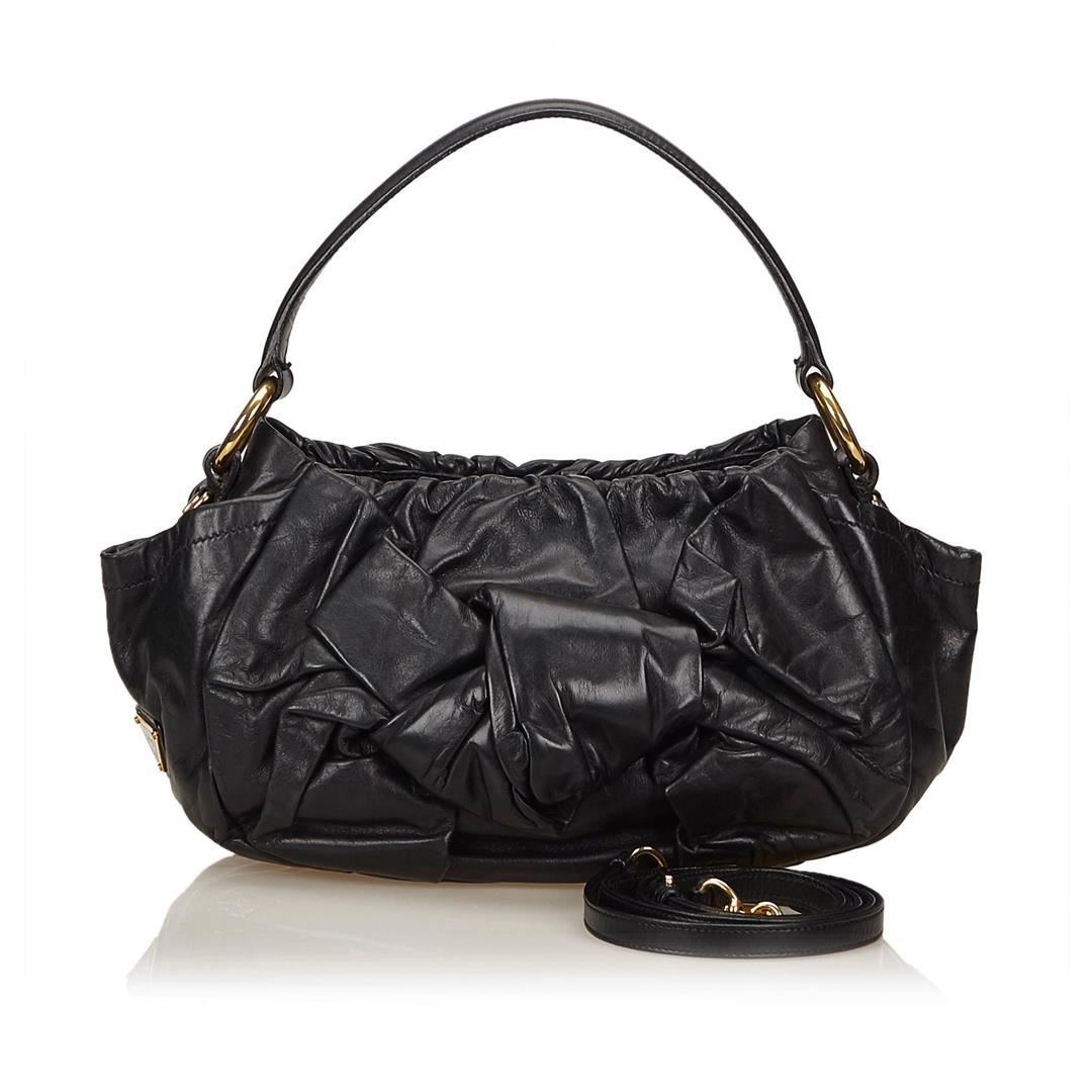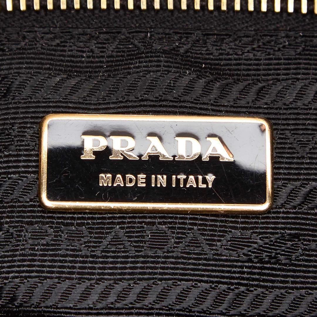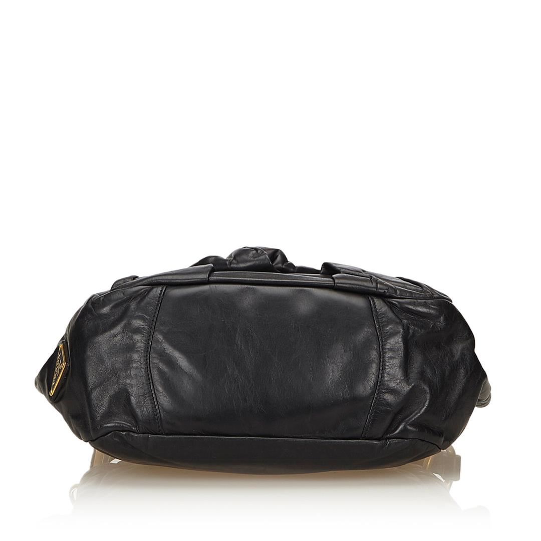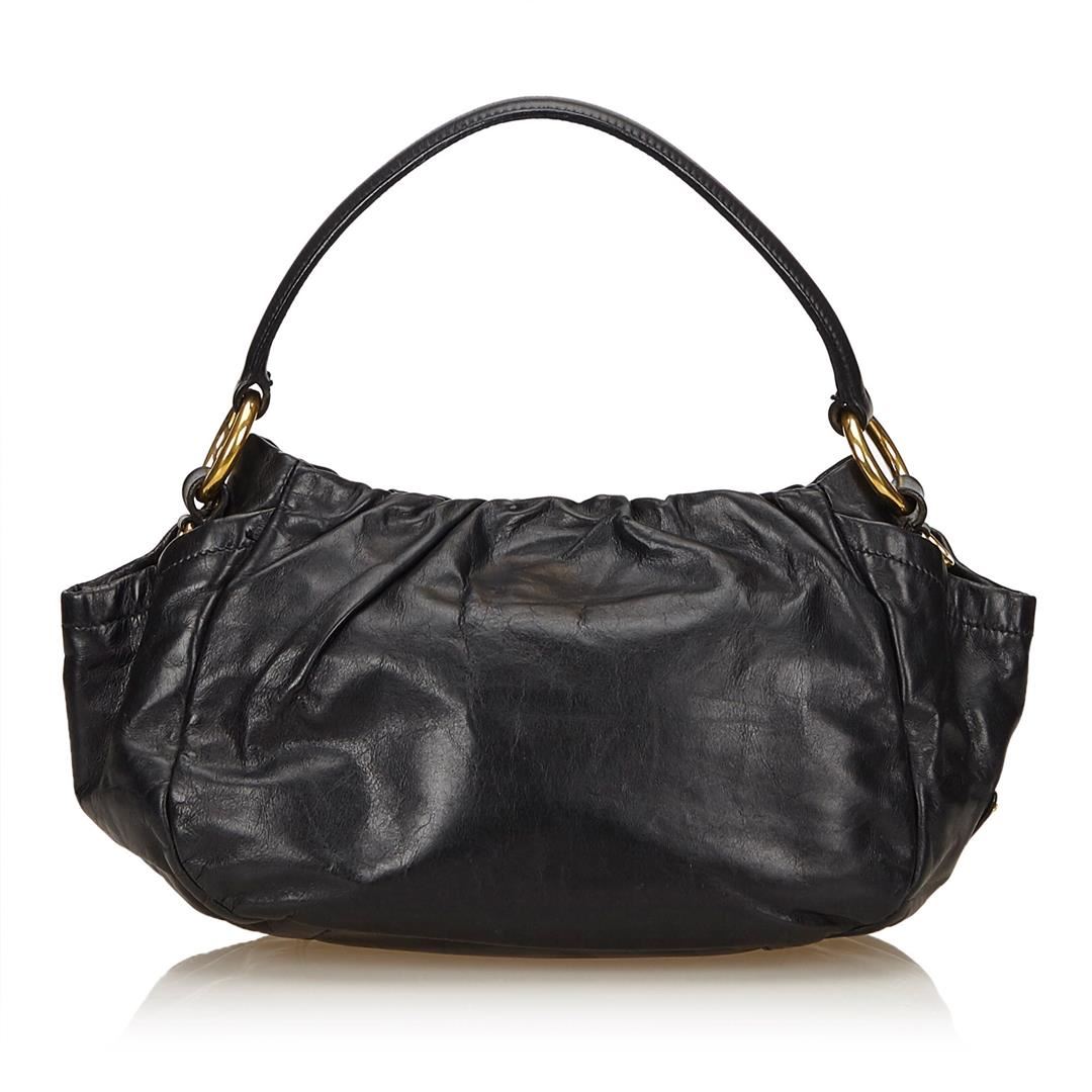 One Prada Leather Handbag. This handbag features a leather body, flat leather handle, top magnetic closure, and interior zip pocket.