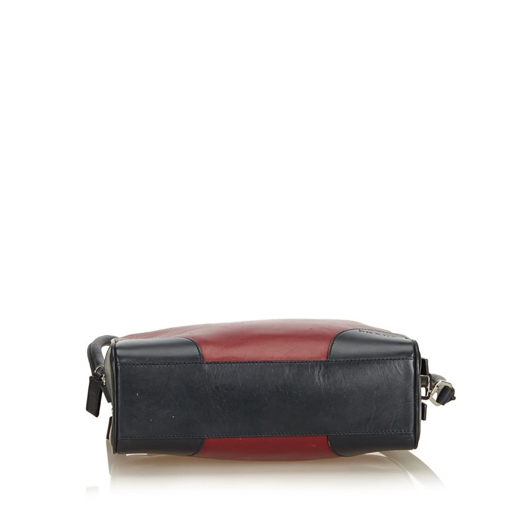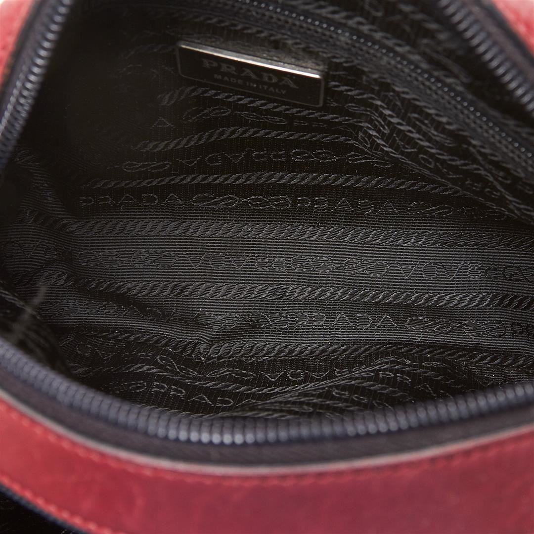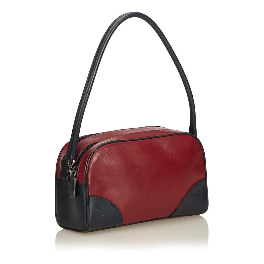 One Prada Leather Shoulder Bag. This shoulder bag features a leather body, rolled leather handle, dual compartments with top zip closures, and an interior zip pocket.