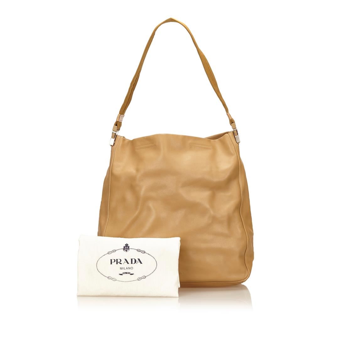 One Prada Leather Shoulder Bag. This shoulder bag features a leather body, a flat shoulder strap, an open top, and an interior zip pocket.