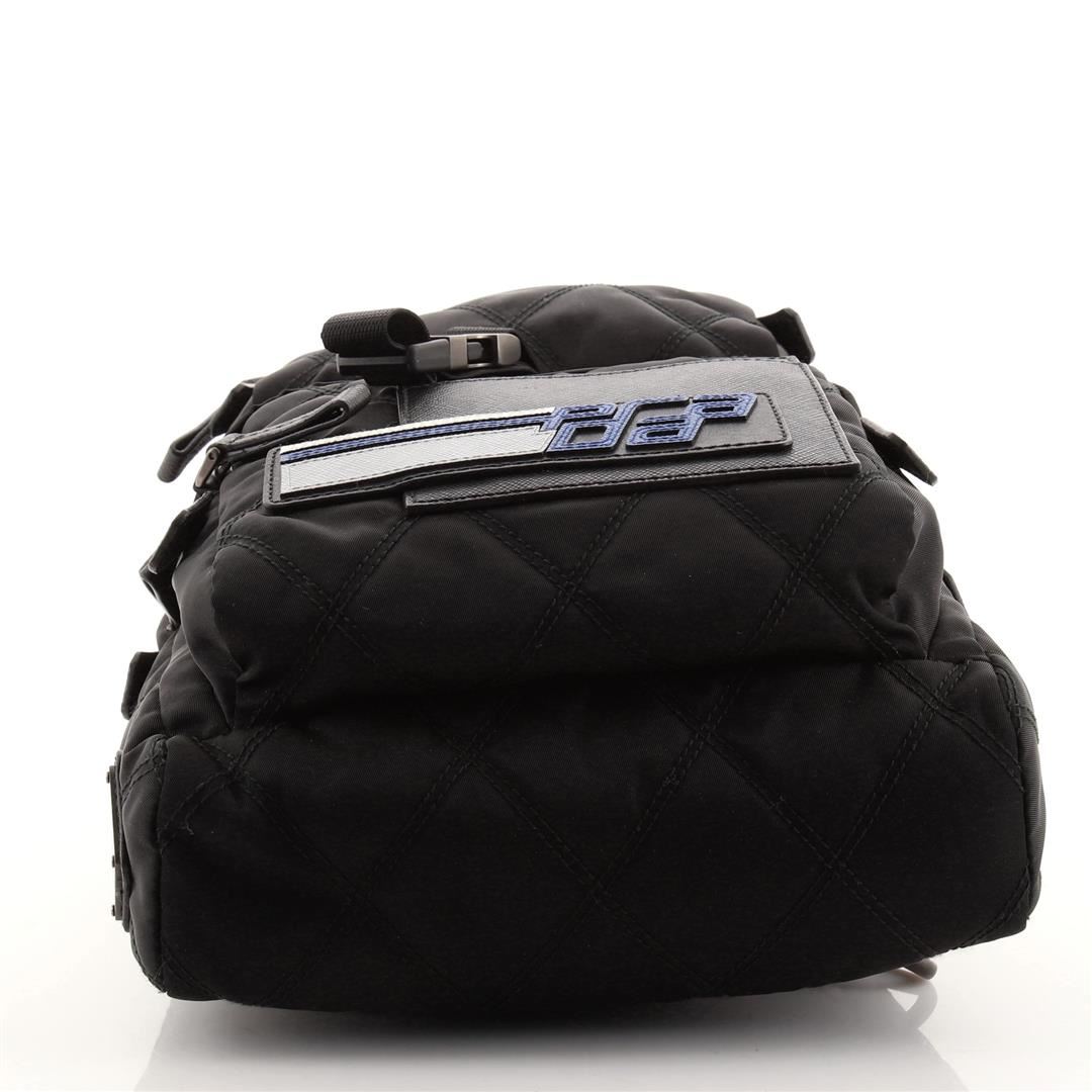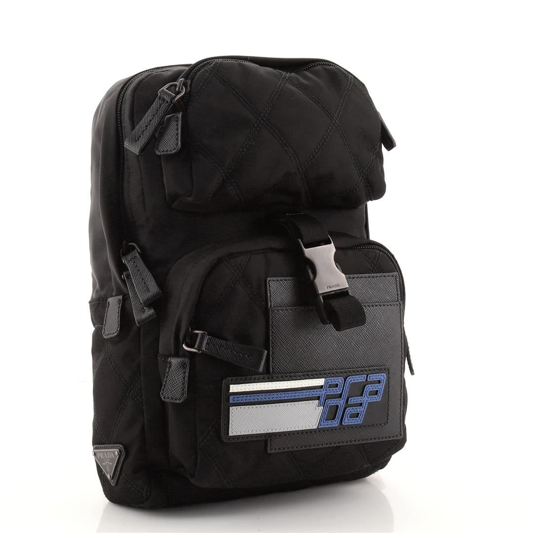 One Prada Logo Patch Buckle Sling Bag Quilted Tessuto with Saffiano Leather. Item is sold AS-IS. All available information is listed in the description and shown in the photo. Prada Logo Patch Buckle Sling Bag Quilted Tessuto with Saffiano Leather. Creasing and minor wear on exterior, scratches on hardware.