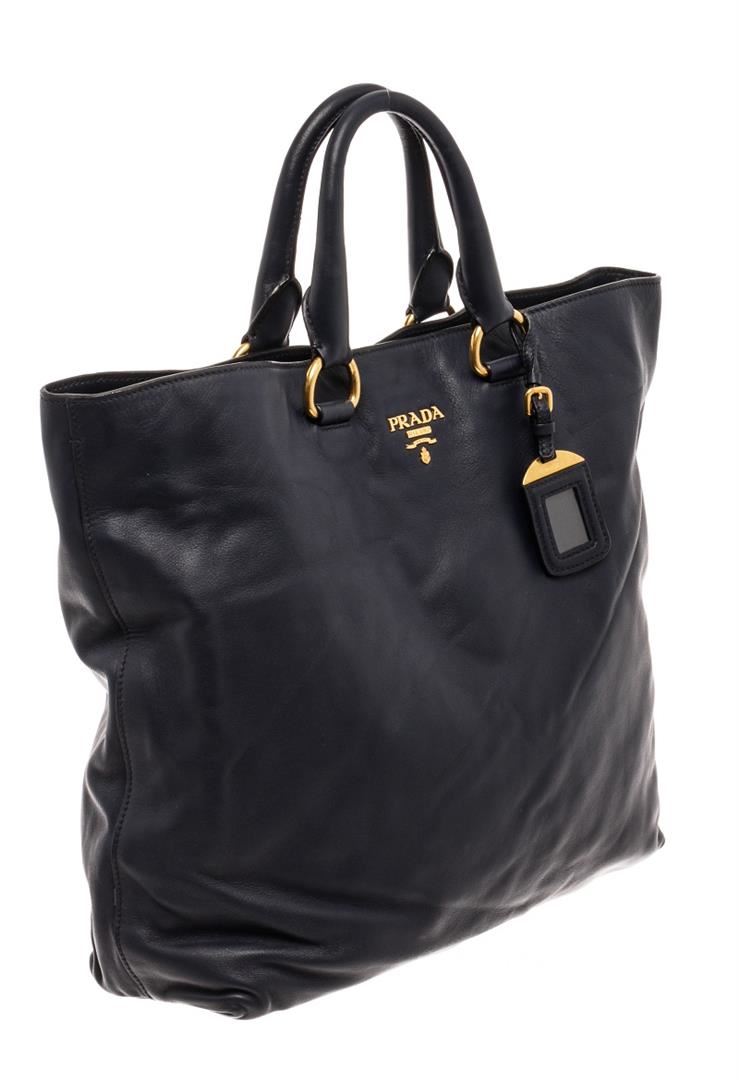 Prada Navy Leather 2Way Shoulder Bag. All available information is listed in the description and shown in the photos. Prada Navy Leather 2Way Shoulder Bag with black leather, logo lettering, transparent id slot tag, concealed magnetic fastening, two top handles, internal zip pocket, internal logo patch, leather lining, gold-tone hardware, square body. Height: 14.5" Width: 16.9" Depth: 1.57", Handle Drop: 5.11" / 37 x 43 x 4 Cm