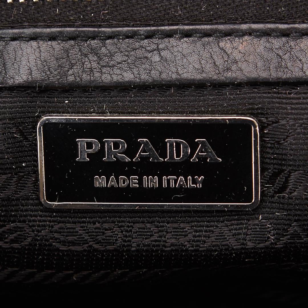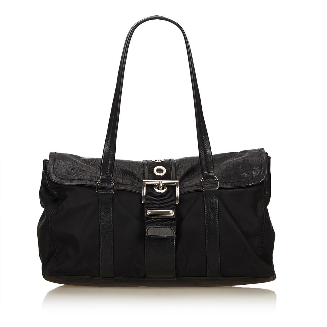 One Prada Nylon Shoulder Bag. This shoulder bag features a nylon body with leather trim, top flap and front strap with magnetic closure, flat leather straps, and an interior zip pocket.