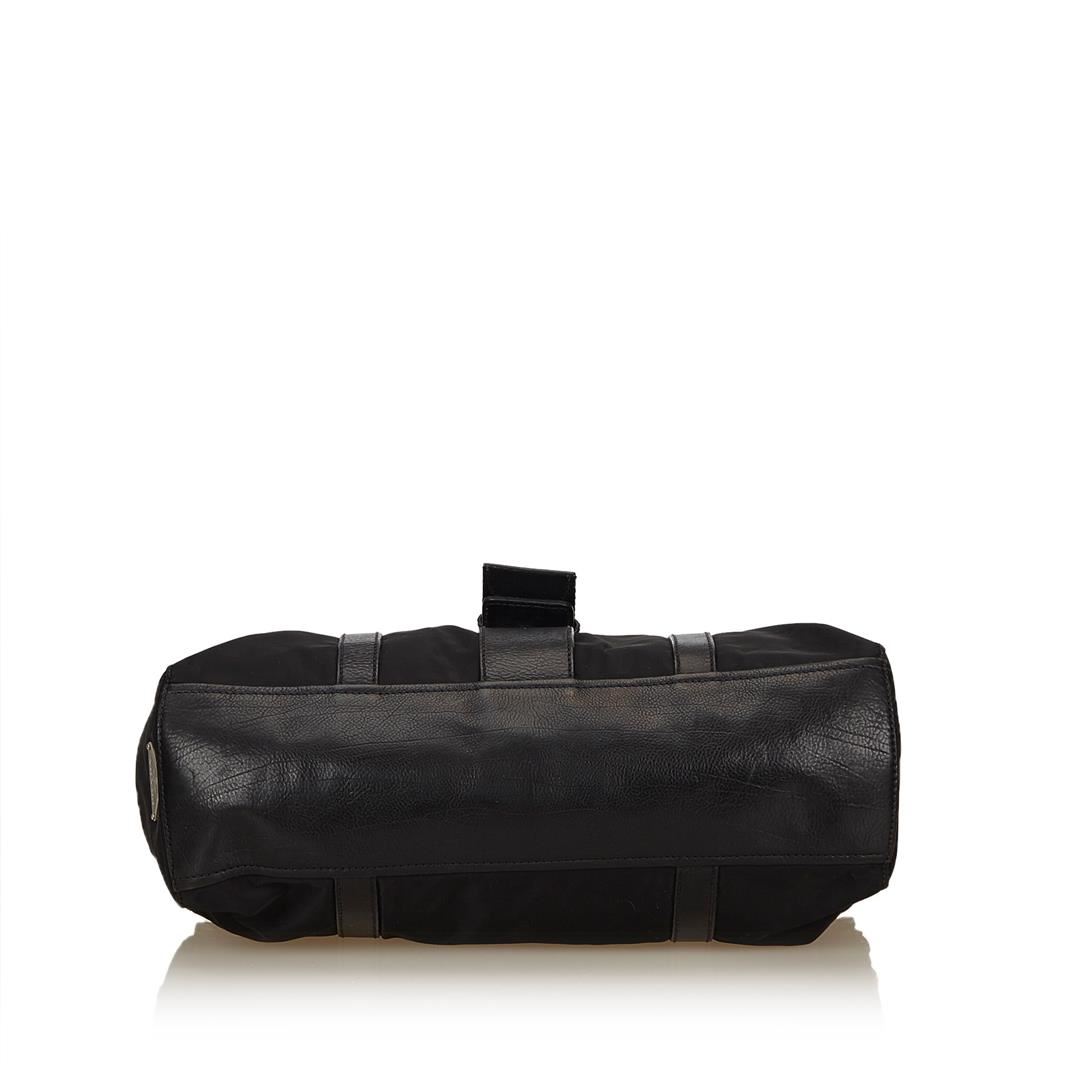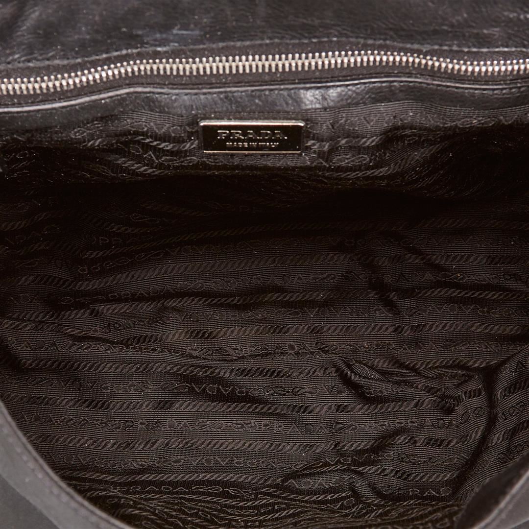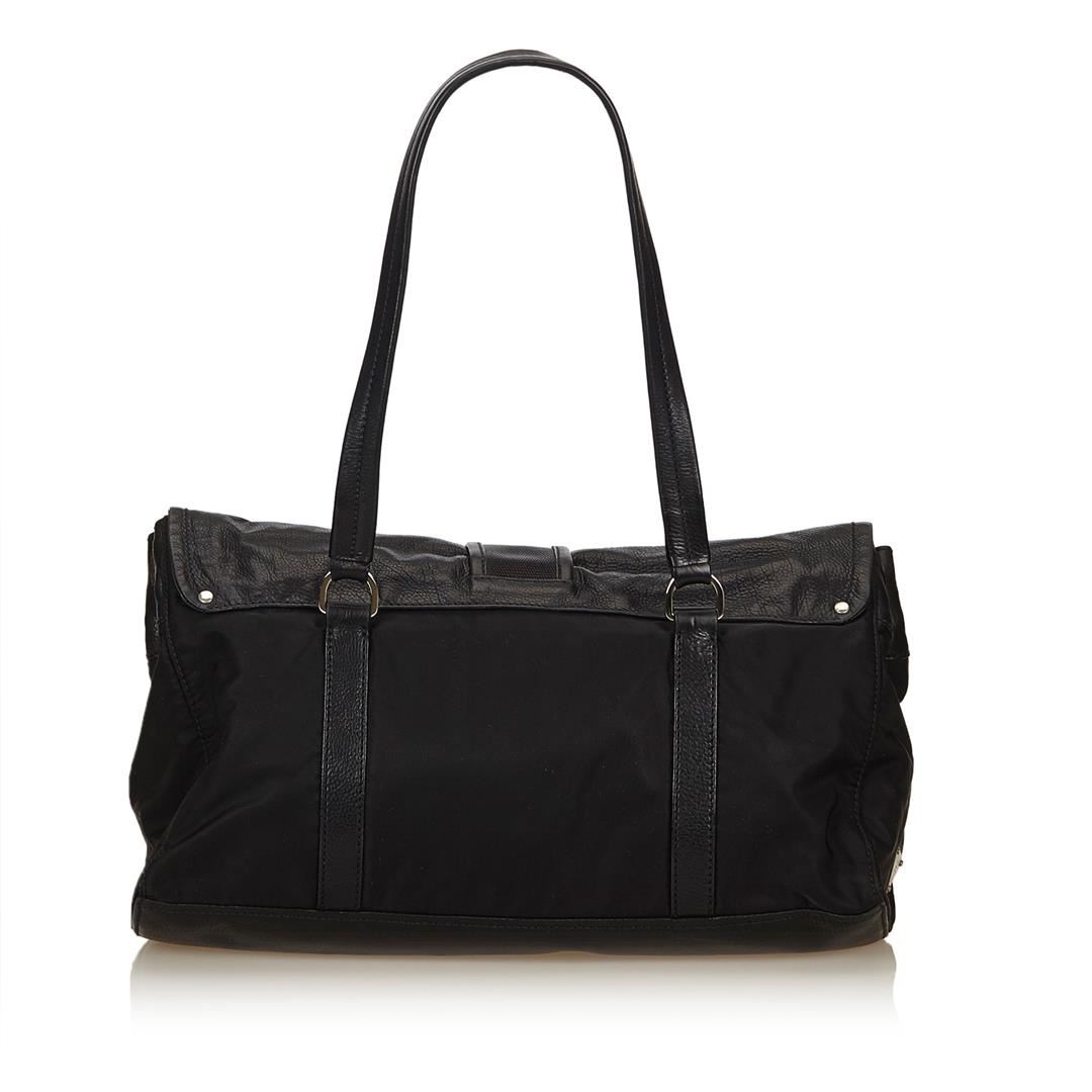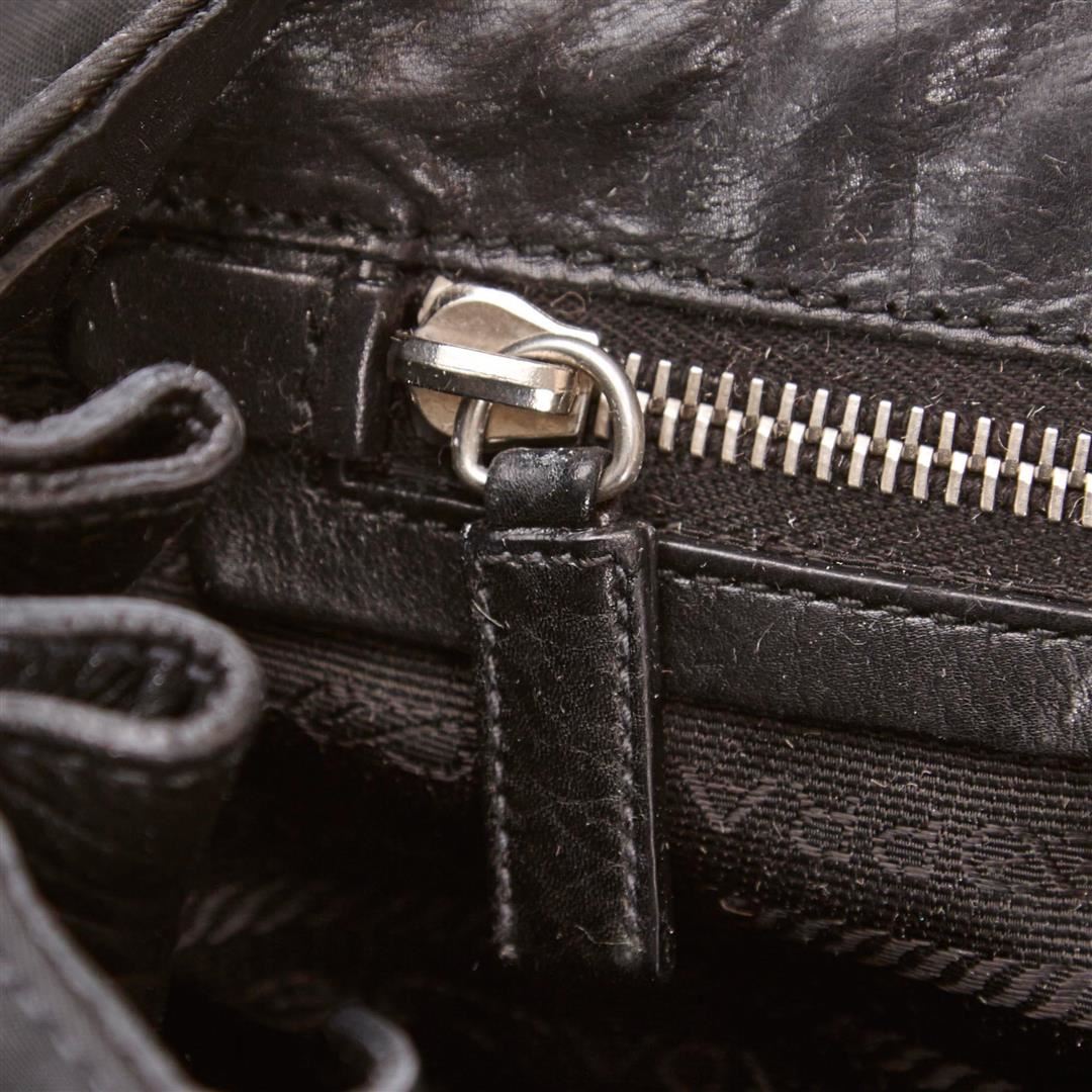 One Prada Nylon Shoulder Bag. This shoulder bag features a nylon body with leather trim, top flap and front strap with magnetic closure, flat leather straps, and an interior zip pocket.