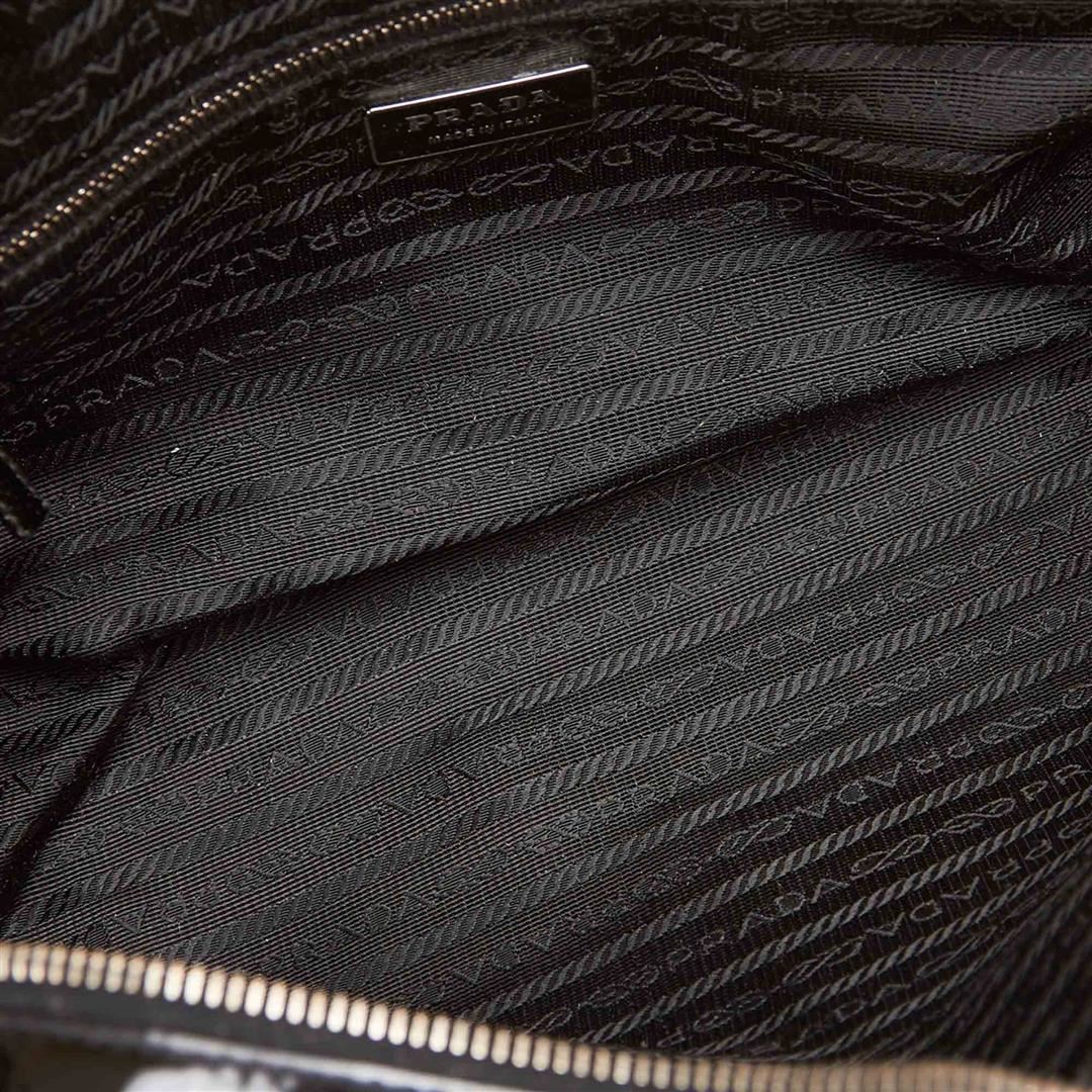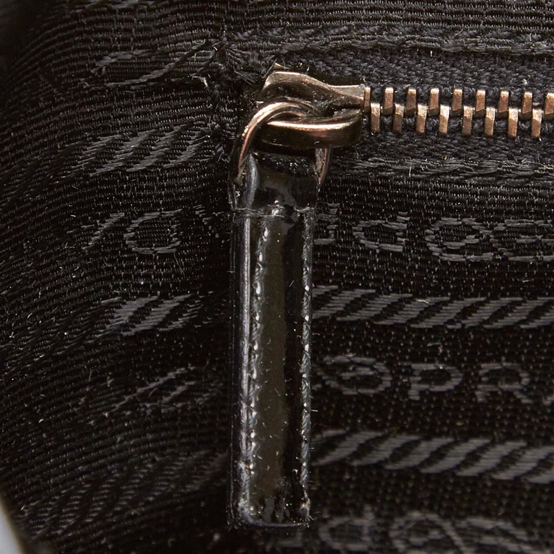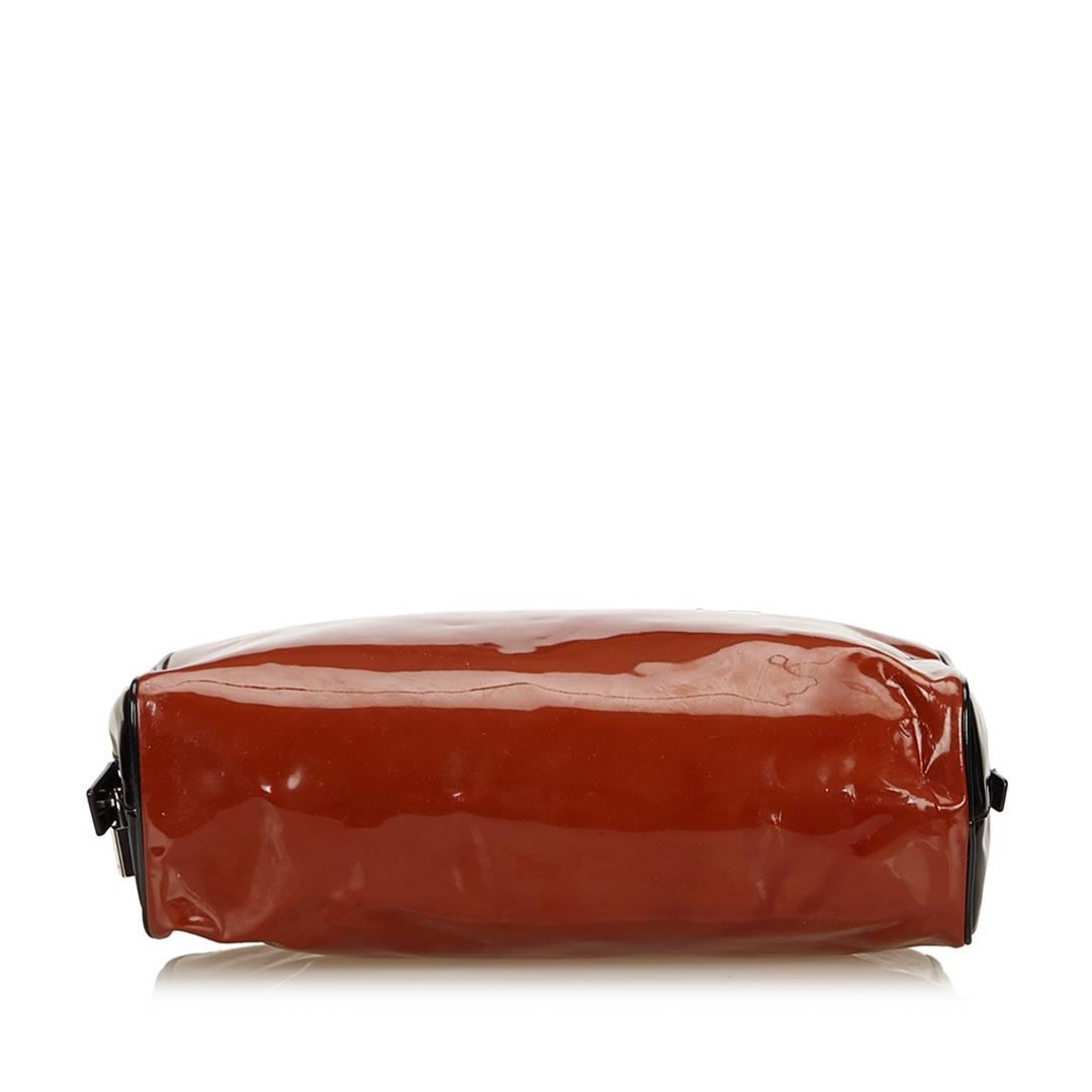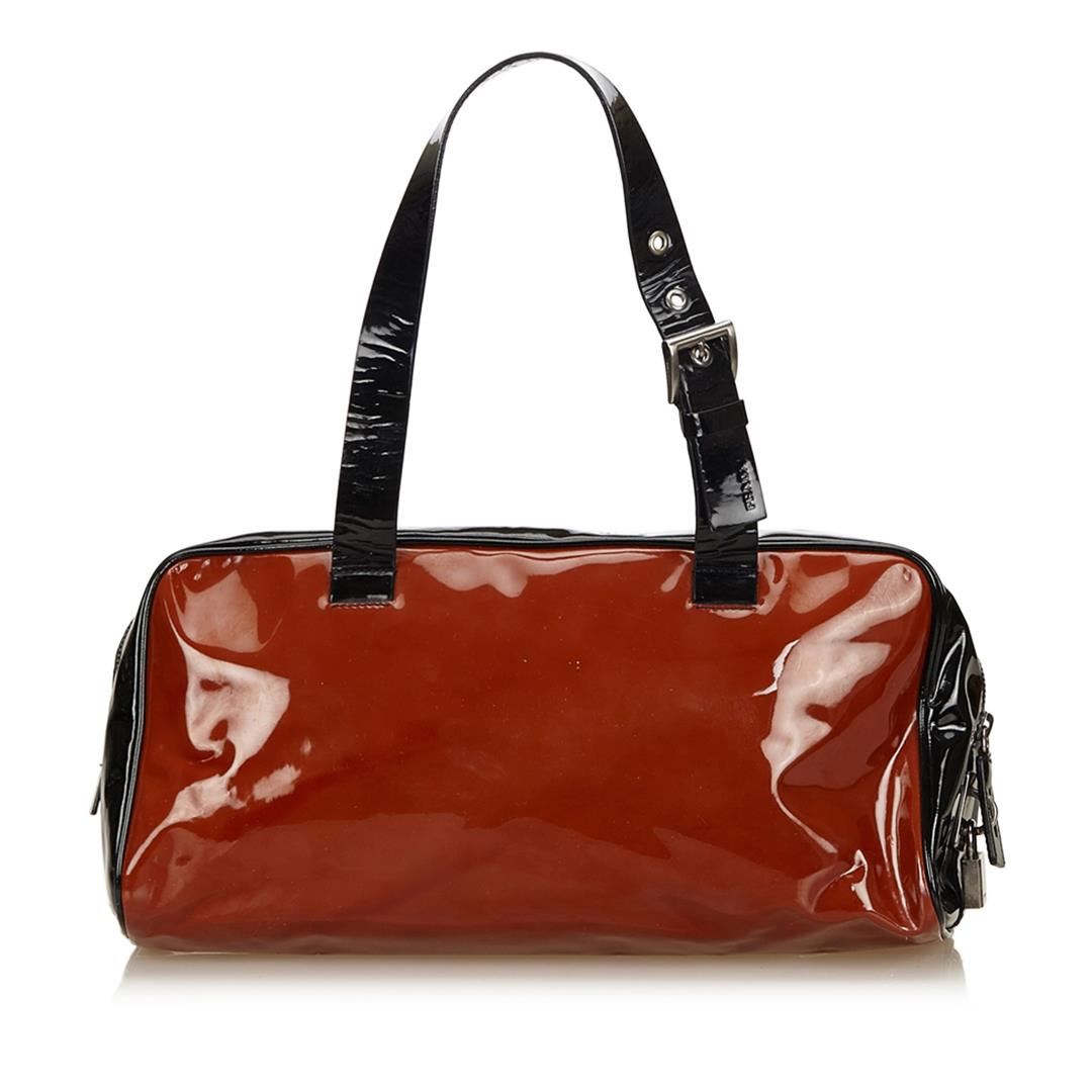 This handbag features a patent leather body, flat leather handles with belt details, top zip closure, and interior zip pocket.