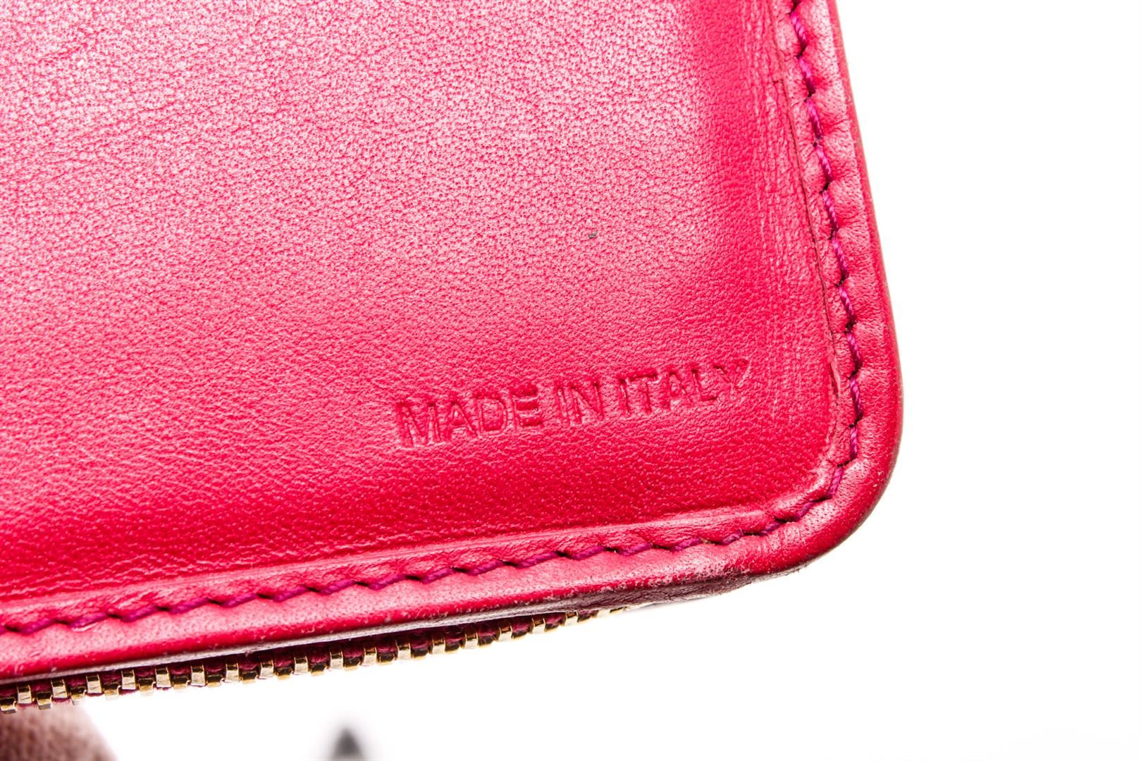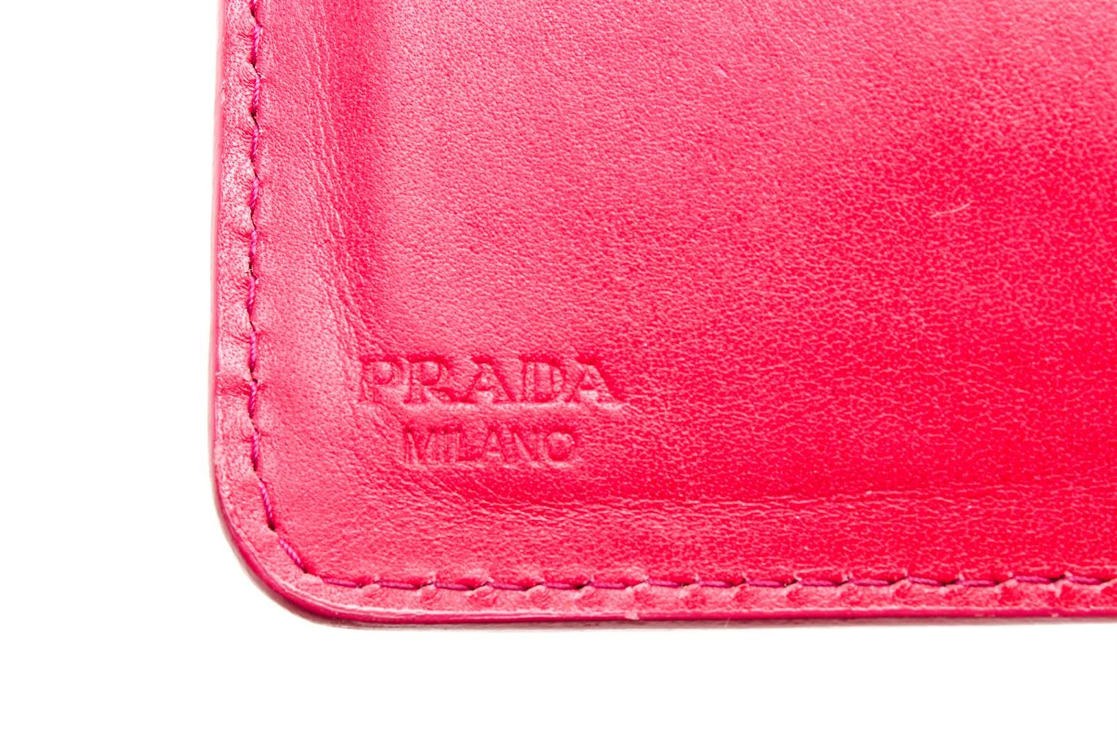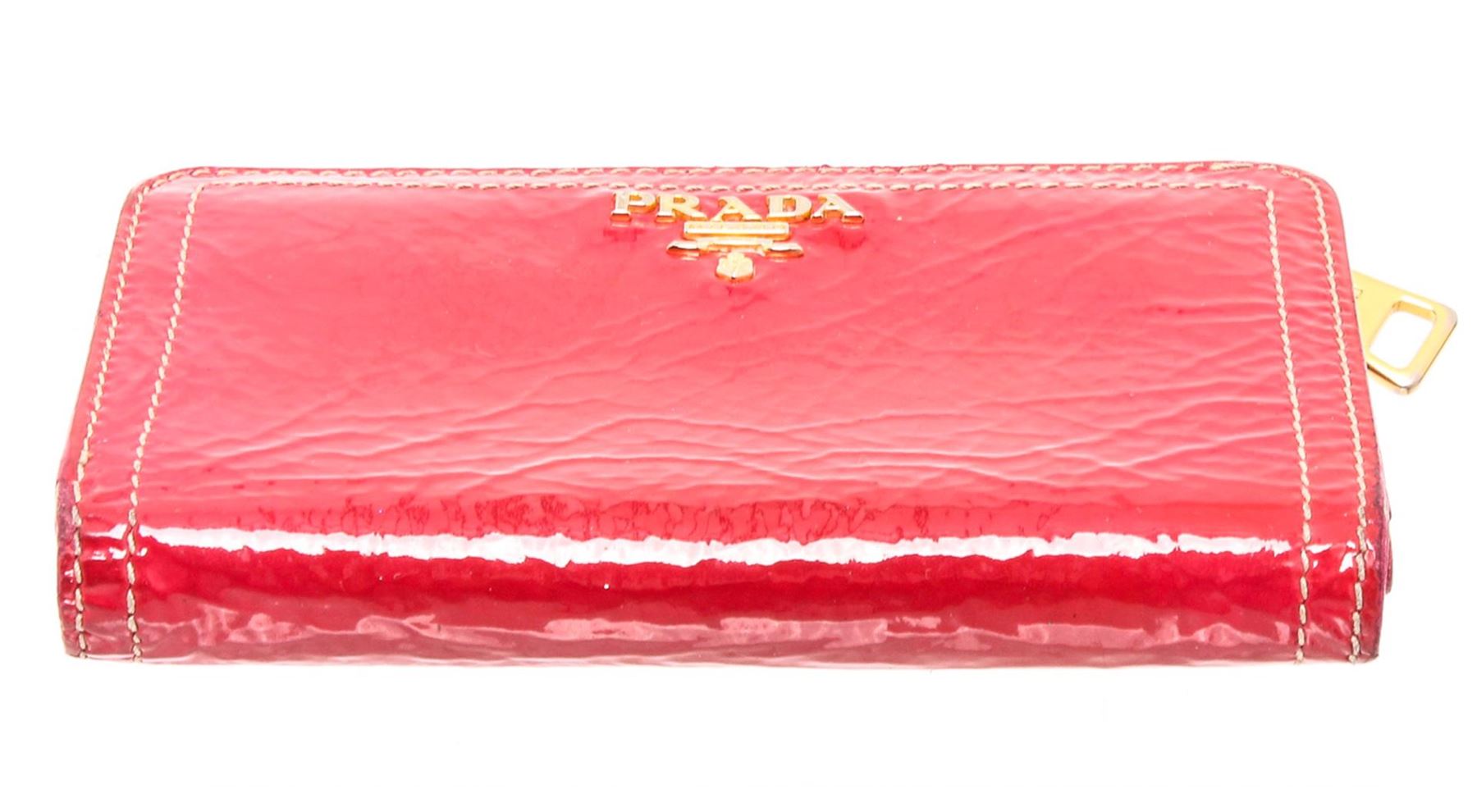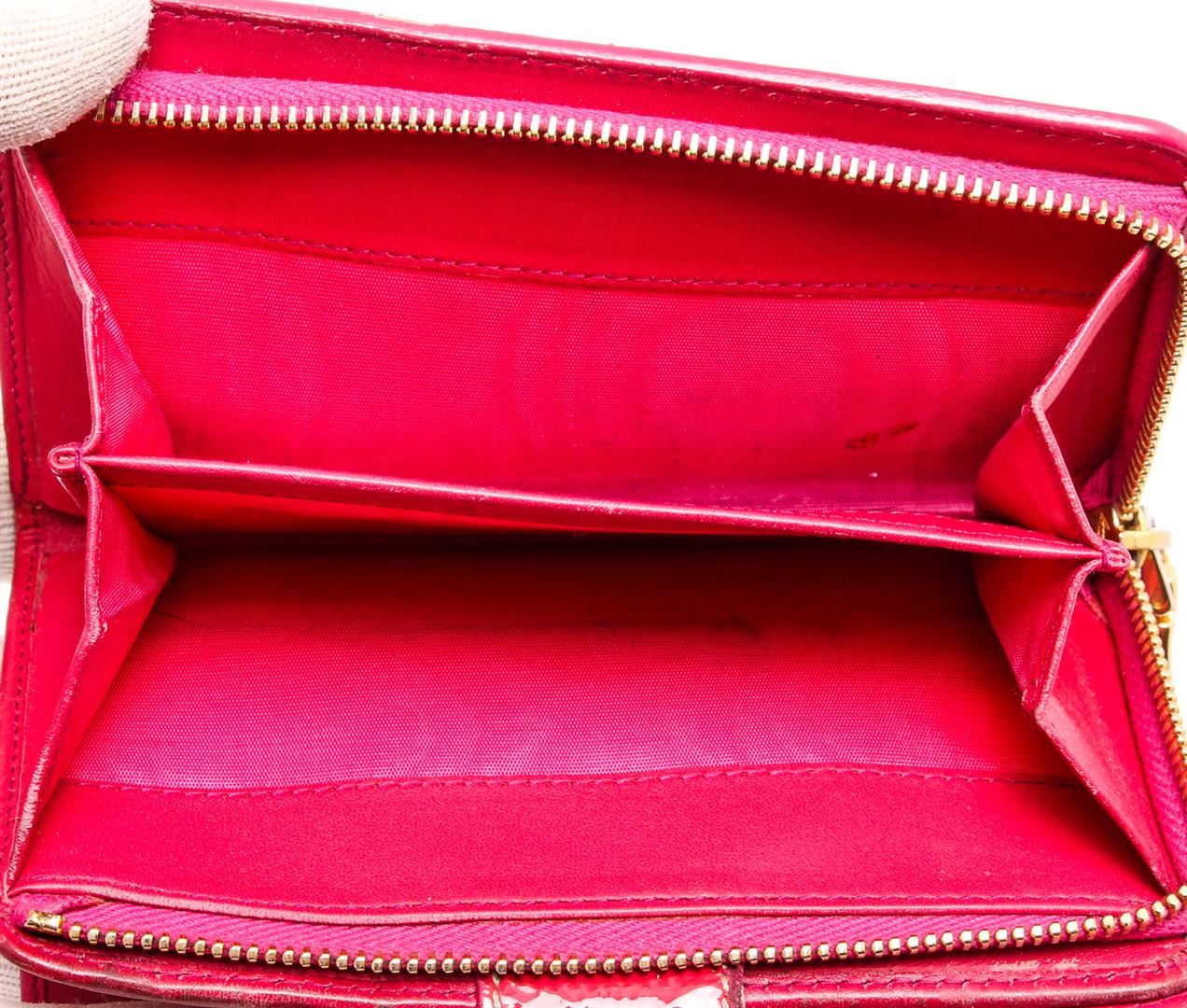 Prada Pink Patent Leather Tab Wallet with gold-tone hardware, logo placard at front, pink leather interior lining, three slip pockets, ten card slots, one zip pocket and overall snap tab closure.