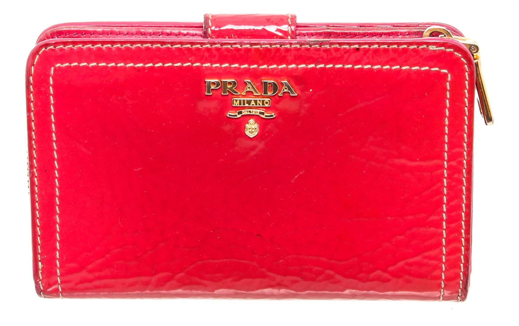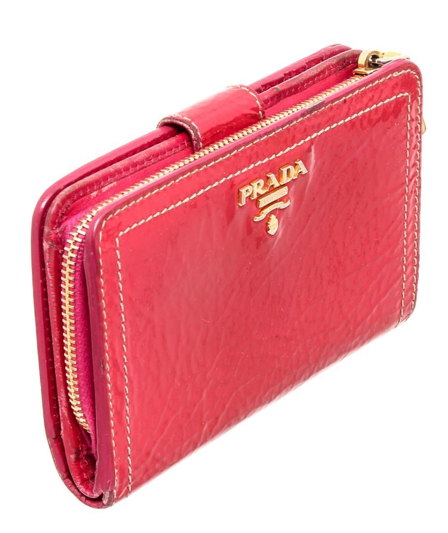 Prada Pink Patent Leather Tab Wallet with gold-tone hardware, logo placard at front, pink leather interior lining, three slip pockets, ten card slots, one zip pocket and overall snap tab closure.