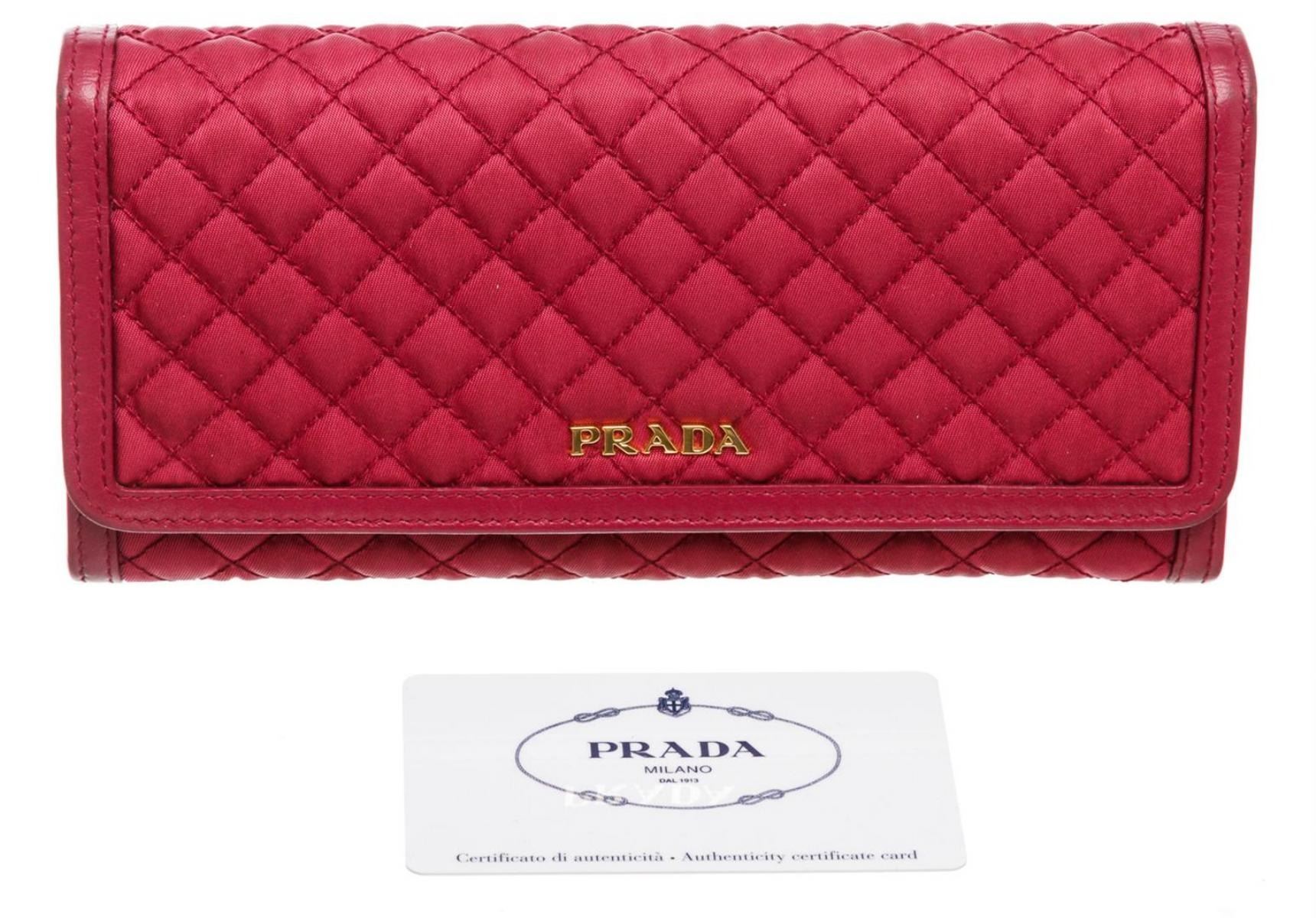 Pink quilted fabric leather Prada flap wallet with gold-tone hardware, tonal leather lining, two slip pockets under front flap, ten credit card slots, three compartments one with zipper closure, two side slip pockets and flap with snap button closure. Authentic.