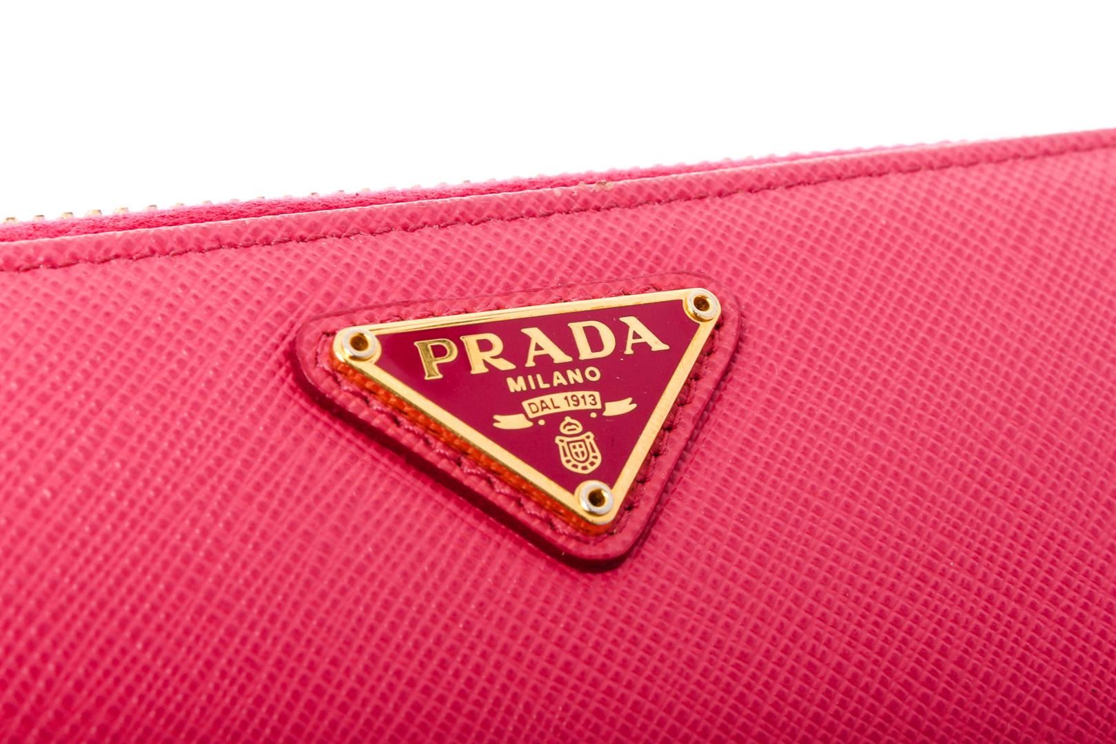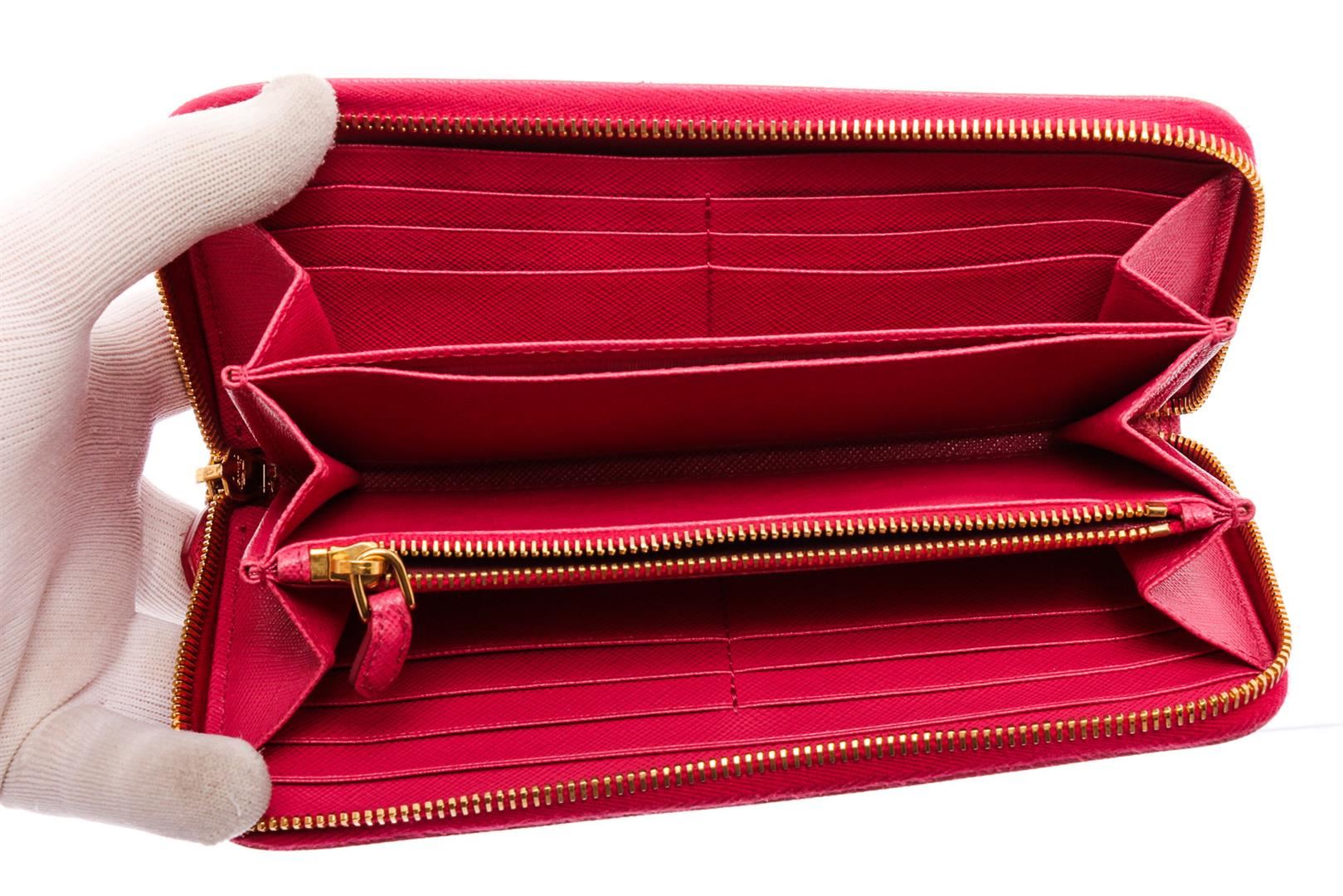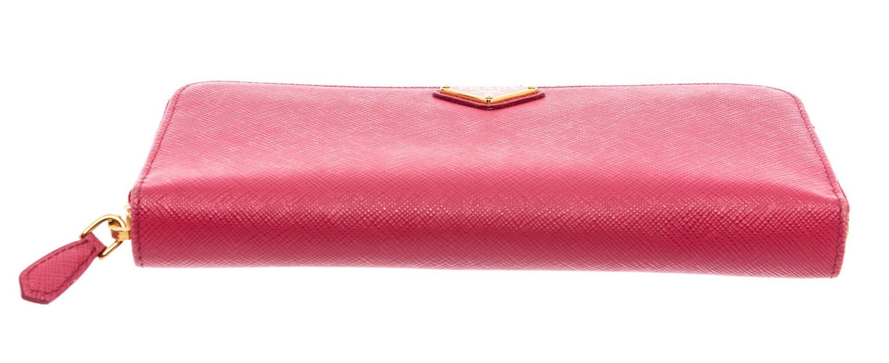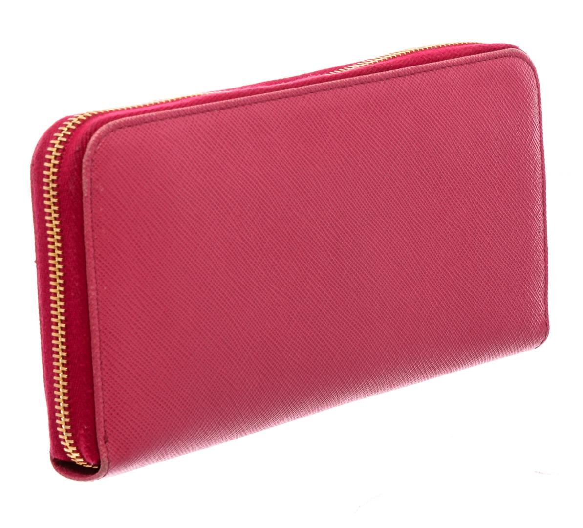 Saffiano leather Prada continental wallet with gold-tone hardware, logo adornment at front, five interior compartments; one with zip closure, tonal leather lining, dual bill compartments at interior walls, 12 card slots and zip-around closure.