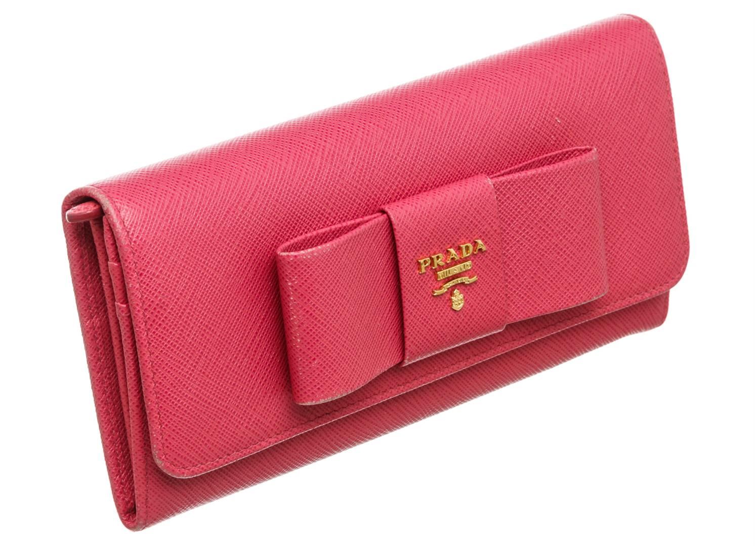 Pink Saffiano Lux leather Prada Fiocco wallet with gold-tone hardware, bow embellishment featuring logo adornment at front, exterior zip pocket at back, three interior compartments; one with zip closure, tonal leather lining, four bill compartments, 10 card slots at interior wall and dual snap closures at front flap.